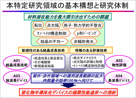 窒化ガリウム(GaN)、窒化アルミニウム(AlN)、窒化インジウム(InN)に代表される窒化物半導体は、その優れた物理的特徴から、青色・緑色発光ダイオード(LED)、白色光源、青紫色レーザ(LD)などを次々と実現し、短期間のうちに実用化を成し遂げ、社会の発展に大きく寄与してきた。しかし、窒化物半導体のもつ材料本来の能力(ポテンシャル)からすれば、これまで開発された技術の範囲は、そのほんの一部でしかない。本領域においては、材料、物性、デバイスの全ての階層での全波長領域(紫外域〜赤外域)にわたる横断的研究に取り組むことによって、「新規結晶成長技術の開発」と「欠陥物理と発光機構、不純物活性化機構の解明」に基づいて、窒化物半導体が本来持つ優れた潜在能力を極限(内部量子効率100%)まで引き出し、その適用波長領域の限界を外縁に広げる(200 nm〜2μm)ことを目指す。