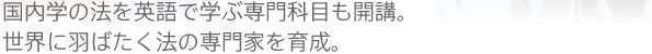 国際企業の法務担当、外交官、また各種国際機構のスタッフなど、世界の法に関する知識と高度な国際感覚が必要となる仕事に従事できる人材の育成をめざします。国際法や国際取引法、国際私法、あるいは英米法等、国際的な視野のもとに法律を学ぶカリキュラムを開設。また2回生の「国際関係法入門」など国際法をはじめとした専門領域全体を学ぶ講義を開講し、法の専門知識とともに国際社会で必須となる高度な外国語運用能力を養います。ほかにも国内外でのインターンシップやフィールドワークの機会を設け、現場体験を通じて法の重要性と実効性を確かめていきます。本課程の学生は全員が国際インスティテュートの「国際法務プログラム」に所属します。