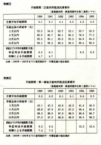 簡素化法が口頭弁論をより良く準備し、かつ、形式的な弁論期日を避けるという目的を達成したか否かという問題は、私の印象では、これを肯定できる。確かに当初、実務では一部においてしばしばいわゆる「繋ぎ期日」、すなわち、事件の呼び上げおよび書面の引用の他に何も行わない期日を開く傾向が存在したが、この不都合は今日かなり改善されているように思われる。もっとも、他方では、複雑多様な事実群(Sachkomplexe)に係わる訴訟資料を伴う手続では、できるだけ一回の主要期日でもってやりくりしようとする見解も、実現不可能であることが判明している。一つの構造化、すなわち、一歩一歩進めることも、ここでは十分に訴訟経済に適いうる。しかし、全体としては、入手可能な統計上の調査(19)によれば、弁論期日の数は限度内(平均して一期日と二期日の間)にあることを伺い知ることができる。手続期間も、いずれにしても第一審においては甘受できるレベルに留まっている。事務処理量が多くなり、裁判官および事務官の人員の釣り合いのとれた増員が追いつかない点に鑑みれば、これは、私の印象ではあるが、民事訴訟法が機能していることの証左である。残念ながら、どの程度まで書面先行手続および早期第一回期日が選択され、この手続形成が手続期間とどう関係しているかに関するデータは存在しない。