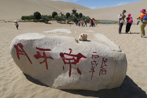 ![]() 鳴沙山から下りて景区出口に向かう途中、「鳴沙山」の碑があったのでその上に乗って再び山を望む。 ぼくが米粒のようだ。 |
