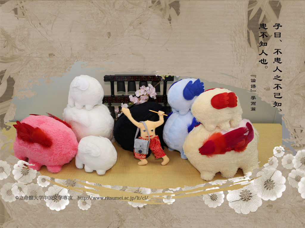 その2 『論語』學而篇 子曰く、學びて時にこれを習ふ、亦た説(よろこ)ばしからずや。 朋有り遠方より来(きた)る、亦た樂しからずや。 人知らずして慍(うら)みず、亦た君子ならずや。 先生はおっしゃった、学んで適切な時にこれを実修する、なんとも悦ばしいことだ。(学問を通じて)遠くからも友達が来る、なんとも楽しいことだ。人に自分のことを知ってもらえなくとも恨まない、なんとも立派な人物だ。 『論語』冒頭の有名な文。学ぶことが好きな孔子らしい言葉です。立命館の衣笠キャンパスにある学而館はこの句から名をとっています。 ちなみに写真でてこちゃんたちが熱心に読んでいるのは『七書正義』です。 |