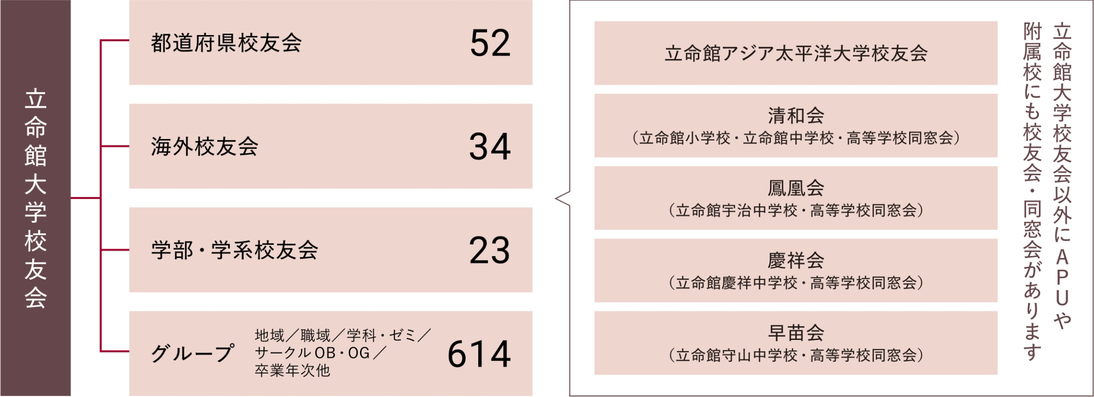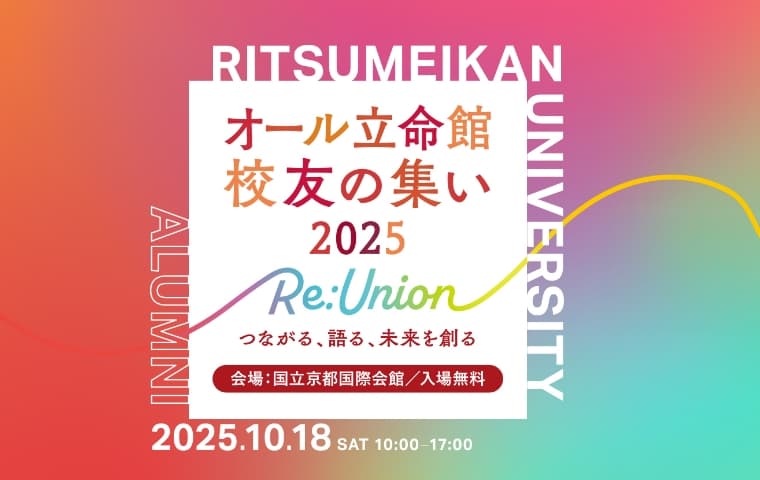 立命館大学校友会は、立命館大学・大学院の卒業生・修了生、そして教職員によって構成される、40万人を超える校友ネットワークです。世代や地域、専門分野を越えて、多くの校友がつながりを持ち、支え合っています。