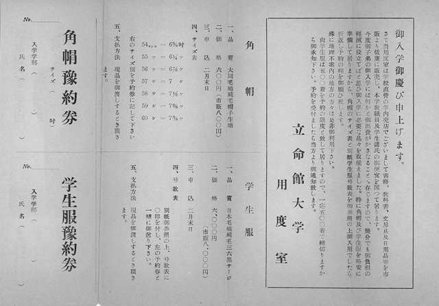 「立命館大学 用度室」とあるのは、現在の生活協同組合のように学生生活に必要な品々を安価に取り扱う部署でした。