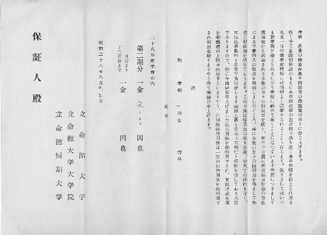 当時の立命館大学は、地方出身学生の比率が高かったこともあり、郷里から送られる学費を、学生自身が大学窓口で支払う事例が多かったのでしょう。