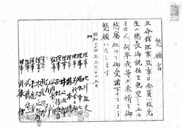 選挙の結果、末川は総長として選出されましたが、辞意に至る経過を踏まえて、教授会・学友会を含め多くの学内諸団体が、あえて就任の要望を伝えるべく嘆願書を差し入れています。