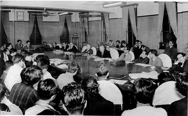 全学協議会風景。奥:学園執行部(中央末川総長)、手前:学生(1958年卒業アルバムより)