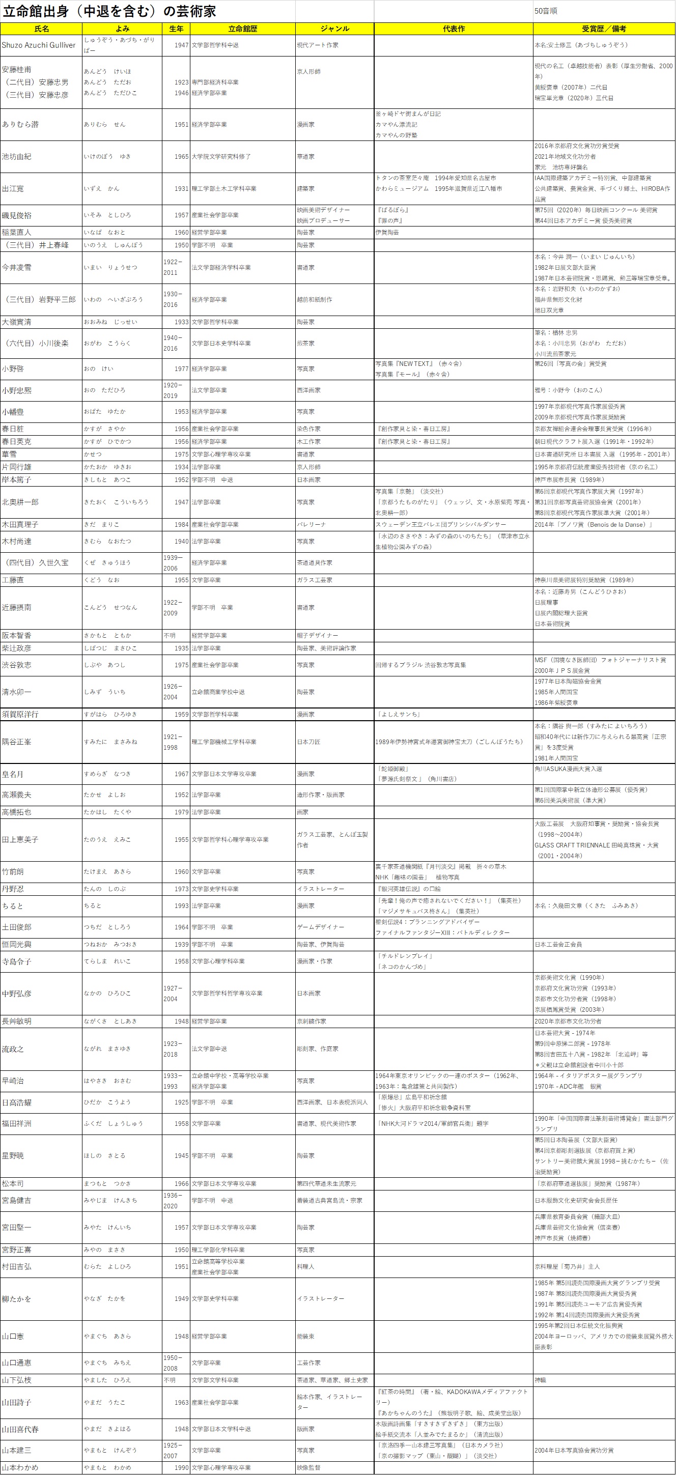 インターネットで「立命館出身の芸術家」を検索した中から、今回は62名の方々を紹介します。あくまでインターネット検索なので、情報ソースが不確実であったり、在籍時の所属がわからなかったりなど、データの検証が十分ではありませんので、ご容赦ください。訂正が必要な点などお気づきの点につきまして、正確な情報をお報せいただくことができれば幸いです。