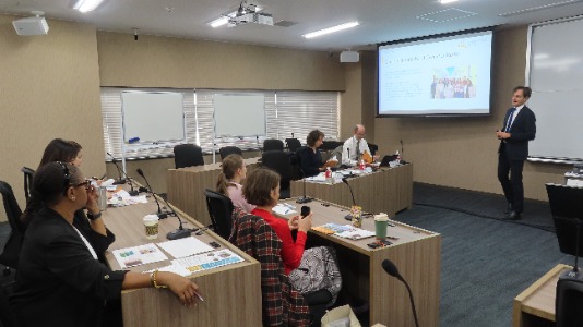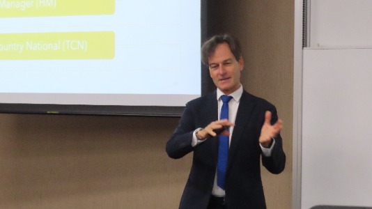 バーマイヤー教授は、経営学部のいくつかの講義やゼミで、「建設的異文化マネジメント」に関する発表を行ったり、学生と意見交換を行ったりしました。修士課程および博士課程の院生とも研究について議論を行い、院生は方法論、概念、内容に関して助言をいただくことができました。