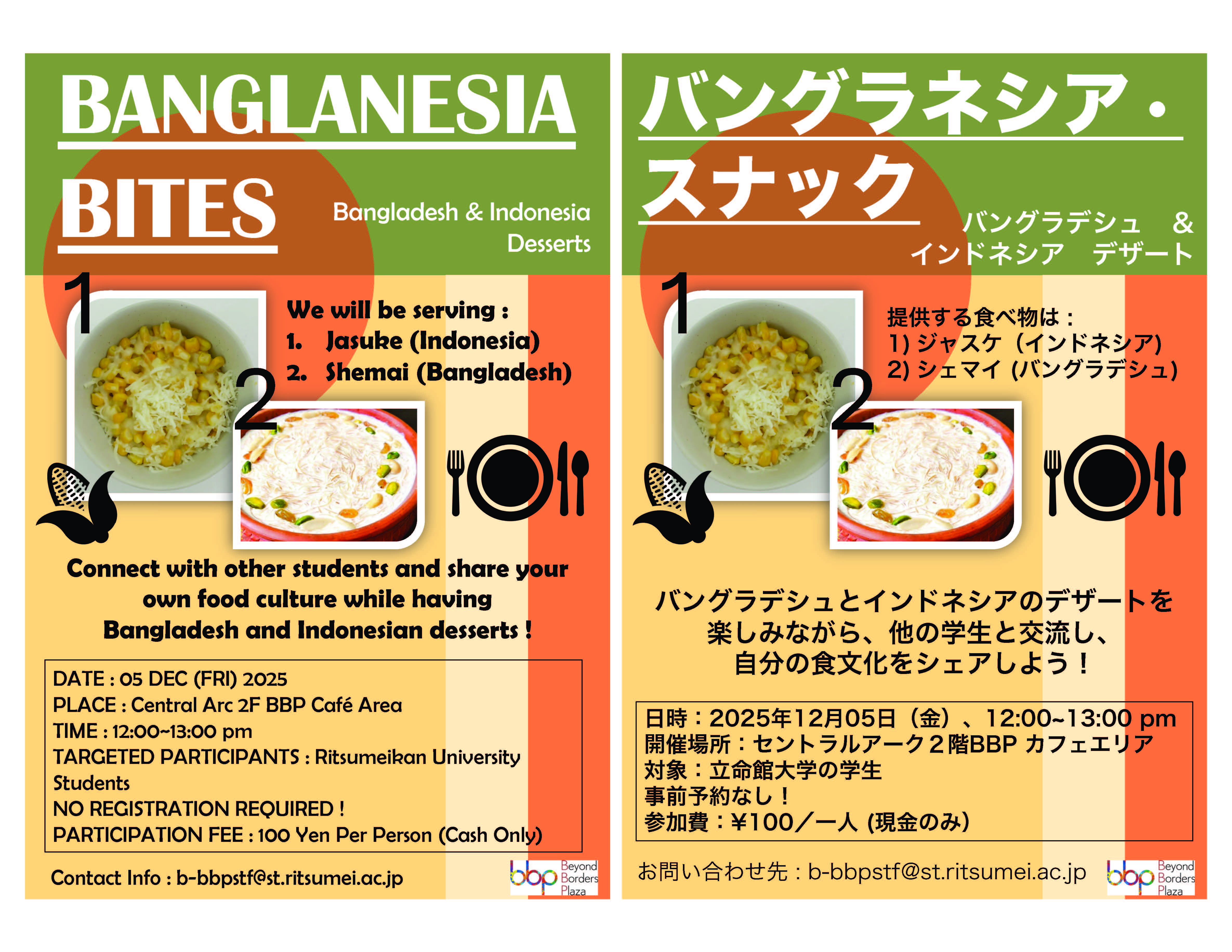 イベント情報Events home イベント情報 / Events BKCのイベント アーカイブ Archive BKCのイベント一覧 11 Dec Thu 衣笠 BKC OIC Let's Talk about Tourist Atractions in Shiga! 08 Dec Mon 衣笠 BKC OIC 2026年4月開設 言語学習+R WEBページ開設キャンペーンのお知らせ 05 Dec Fri 衣笠 BKC OIC BKC|バングラネシア・スナック/BanglaNesia Bites 04 Dec Thu 衣笠 BKC OIC キャンパスクイズ探検~BKC Quest~ Campus Quiz Hunt -BKC Quest- 02 Dec Tue 衣笠 BKC OIC Let’s Talk about Anime and Comic books! 21 Nov Fri 衣笠 BKC OIC Yahei Hot Chili Peppers Tasting Workshop 20 Nov Thu 衣笠 BKC OIC BKC|Sport Event Volleyball & Basketball 18 Nov Tue 衣笠 BKC OIC BKC|イントロドンでつながる!国境を越えたハーモニー/Connecting through Music Intro Quiz! Harmony Across Borders 15 Nov Sat 衣笠 BKC OIC BKC|秋色さんぽ 〜貴船で紅葉と交流を楽しもう〜/Japan’s Autumn Colors~Autumn leaf viewing and cultural exchange in Kifune~ Previous 1 2 3 4 5 6 7 8 9 10 11 12 13 14 15 16 17 18 19 20 21 22 23 24 25 26 27 28 29 30 31 32 33 34 35 36 37 38 39 40 41 42 43 44 45 46 47 48 49 Next