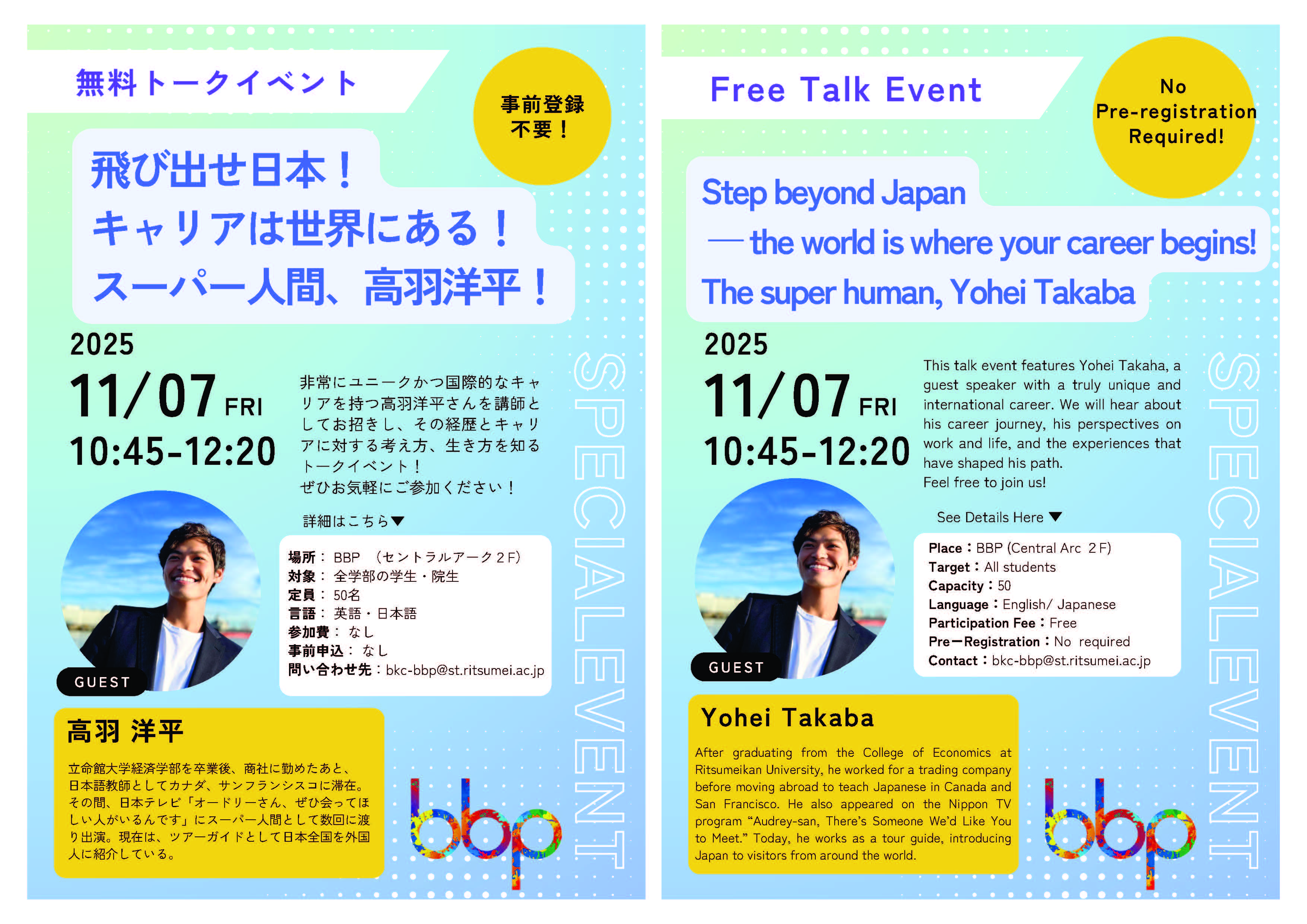 イベント情報Events home イベント情報 / Events BKCのイベント アーカイブ Archive BKCのイベント一覧 14 Nov Fri 衣笠 BKC OIC Pronunciation Power! 07 Nov Fri 衣笠 BKC OIC BKC|グローバルキャリアの築き方 ― 高羽洋平氏 トークイベント/Building a Global Career — A Talk by Yohei Takaba 04 Nov Tue 衣笠 BKC OIC Additional Registration for BBP Language Exchange Program 追加登録受付中 30 Oct Thu 衣笠 BKC OIC BKC| Halloween Night 27 Oct Mon 衣笠 BKC OIC ¡Todos a la mesa! 「食」から広がるスペイン語の世界 27 Oct Mon 衣笠 BKC OIC BBP LEP First Meeting Day 22 Oct Wed 衣笠 BKC OIC Charts, tables and graphs! 14 Oct Tue 衣笠 BKC OIC Learning the card games of American pop culture 14 Oct Tue 衣笠 BKC OIC BKC|Cultural Trivia Board: Share a Fun Fact, Get some Tea! Previous 1 2 3 4 5 6 7 8 9 10 11 12 13 14 15 16 17 18 19 20 21 22 23 24 25 26 27 28 29 30 31 32 33 34 35 36 37 38 39 40 41 42 43 44 45 46 47 48 49 Next