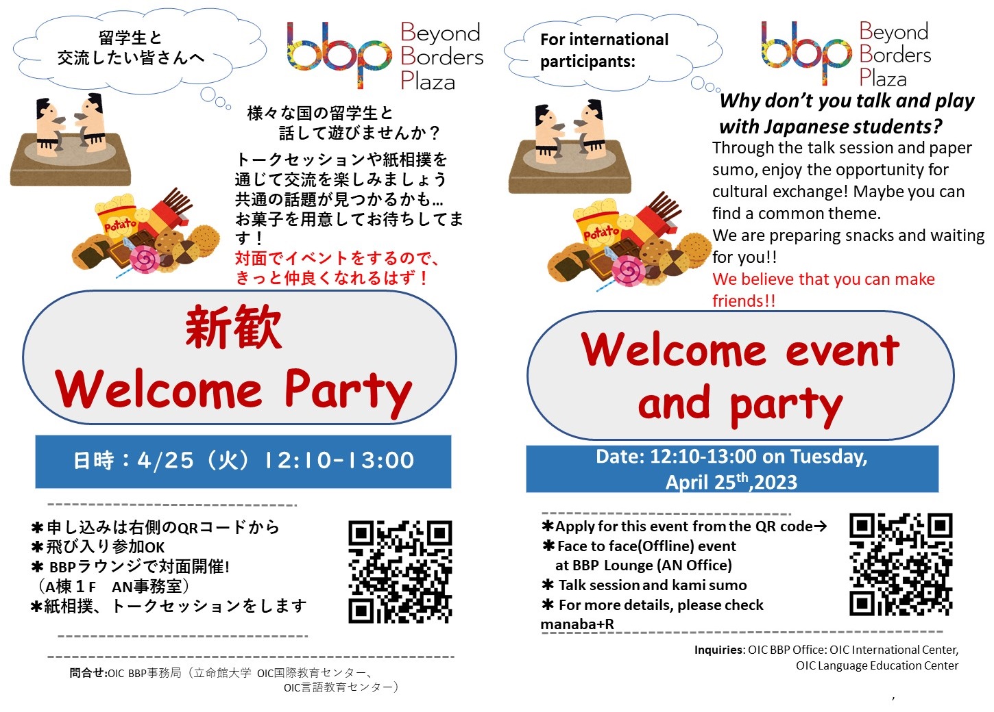 イベント情報Events home イベント情報 / Events OICのイベント アーカイブ Archive OICのイベント一覧 09 Jun Fri 衣笠 BKC OIC Let’s talk with a JICA staff member from Gabonese Republic in West Africa! ( JICA駐在員と話そう!) 06 Jun Tue 衣笠 BKC OIC グローバルクリーンアップ作戦 Global Clean-up Project 03 Jun Sat 衣笠 BKC OIC スペイン語の魅力を知ろう! ~BBP初修外国語促進企画~ 02 Jun Fri 衣笠 BKC OIC The Normal Guys Exploring the World 01 Jun Thu 衣笠 BKC OIC Student Development Seminar Series 19 May Fri 衣笠 BKC OIC かるたで語彙力を増やそう! Increase vocabulary by playing Karuta! 16 May Tue 衣笠 BKC OIC Coffee and Ice break Time 26 Apr Wed 衣笠 BKC OIC IELTSテスト説明会 25 Apr Tue 衣笠 BKC OIC 新歓&Welcome Party 2023 Previous 1 2 3 4 5 6 7 8 9 10 11 12 13 14 15 16 17 18 19 20 21 22 23 24 25 26 27 28 29 30 31 32 33 34 35 36 37 38 39 40 41 42 43 44 45 46 47 48 49 Next