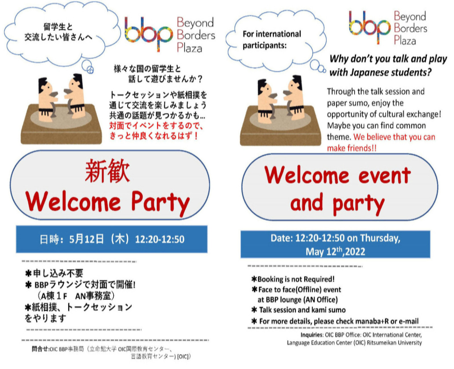 イベント情報Events home イベント情報 / Events OICのイベント アーカイブ Archive OICのイベント一覧 25 May Wed 衣笠 BKC OIC Lunchtime Movie Quiz 19 May Thu 衣笠 BKC OIC OnlineかむかむふらっとBBP/ Come Come Flat BBP 12 May Thu 衣笠 BKC OIC 新歓 Welcome Party 2022 11 May Wed 衣笠 BKC OIC ”American English Pronunciation” 英語の発音を練習しましょう! 10 May Tue 衣笠 BKC OIC フリーランスエディターとは? What is a freelance editor ? 26 Apr Tue 衣笠 BKC OIC 「留学を考える」~第1回準備編~ 18 Apr Mon 衣笠 BKC OIC SUP! Language Exchange Program<登録受付中!/Registration OPEN!> 14 Apr Thu 衣笠 BKC OIC 【動画UP】BKC-BBPダイジェストムービー2018~2021(vol 2 フル) 13 Apr Wed 衣笠 BKC OIC OnlineかむかむふらっとBBP/ Let's talk online! Previous 1 2 3 4 5 6 7 8 9 10 11 12 13 14 15 16 17 18 19 20 21 22 23 24 25 26 27 28 29 30 31 32 33 34 35 36 37 38 39 40 41 42 43 44 45 46 47 48 49 Next