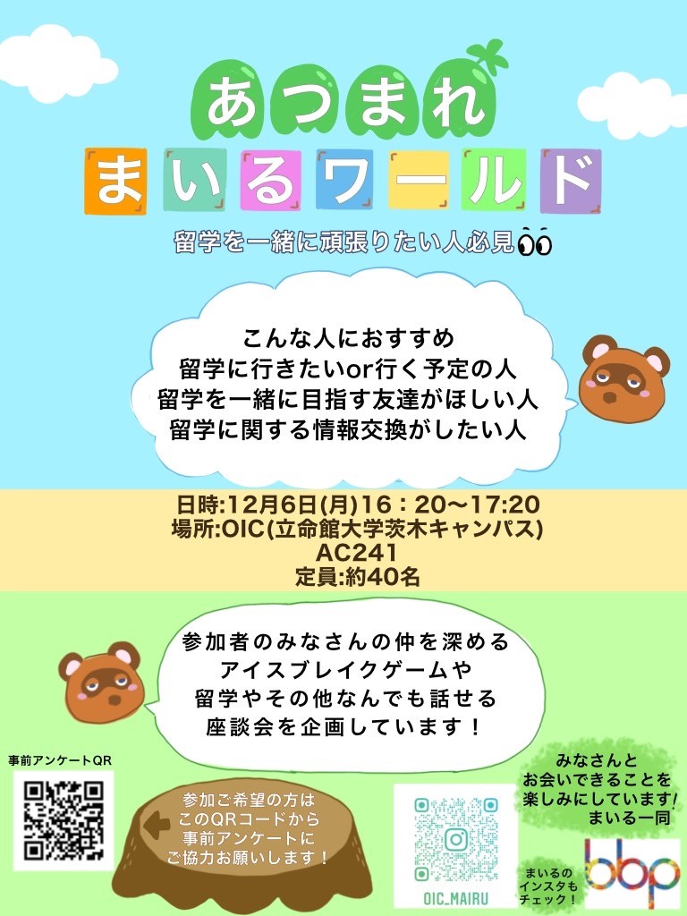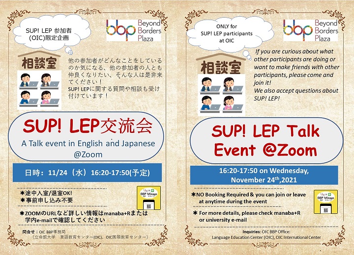 イベント情報Events home イベント情報 / Events OICのイベント アーカイブ Archive OICのイベント一覧 09 Dec Thu 衣笠 BKC OIC (ALL) 留学・語学に興味ある人必見!【OIC BBP主催】「言語学習のヒントを伝授するセミナー」開催決定! 07 Dec Tue 衣笠 BKC OIC (BKC) 20211207 スペイン語圏の文化を学ぼう! 07 Dec Tue 衣笠 BKC OIC (ALL) Culture Shock in Japan 06 Dec Mon 衣笠 BKC OIC (OIC)【OICまいる主催 対面イベント】留学志望者同士の情報交換・交流会/ On-campus talk event of study abroad 04 Dec Sat 衣笠 BKC OIC (キャリア)世界は「やりたいシゴト」にあふれている ~ 理系だからこそ目指せるグローバルキャリアの歩き方~ 30 Nov Tue 衣笠 BKC OIC (Kinugasa) 【BBP新聞第2号発行!】BBPを楽しむ!知る!ための情報をたっぷりお届けします/【BBP Newspaper No.2】We offer you the good information about BBP! 30 Nov Tue 衣笠 BKC OIC (OIC) 交流と相談イベント"Virtual OIC BBP" in November /International exchange and consultation 24 Nov Wed 衣笠 BKC OIC (OIC) SUP! LEP参加者交流会/SUP! LEP Talk event 22 Nov Mon 衣笠 BKC OIC (ALL) Among us with us Previous 1 2 3 4 5 6 7 8 9 10 11 12 13 14 15 16 17 18 19 20 21 22 23 24 25 26 27 28 29 30 31 32 33 34 35 36 37 38 39 40 41 42 43 44 45 46 47 48 49 Next