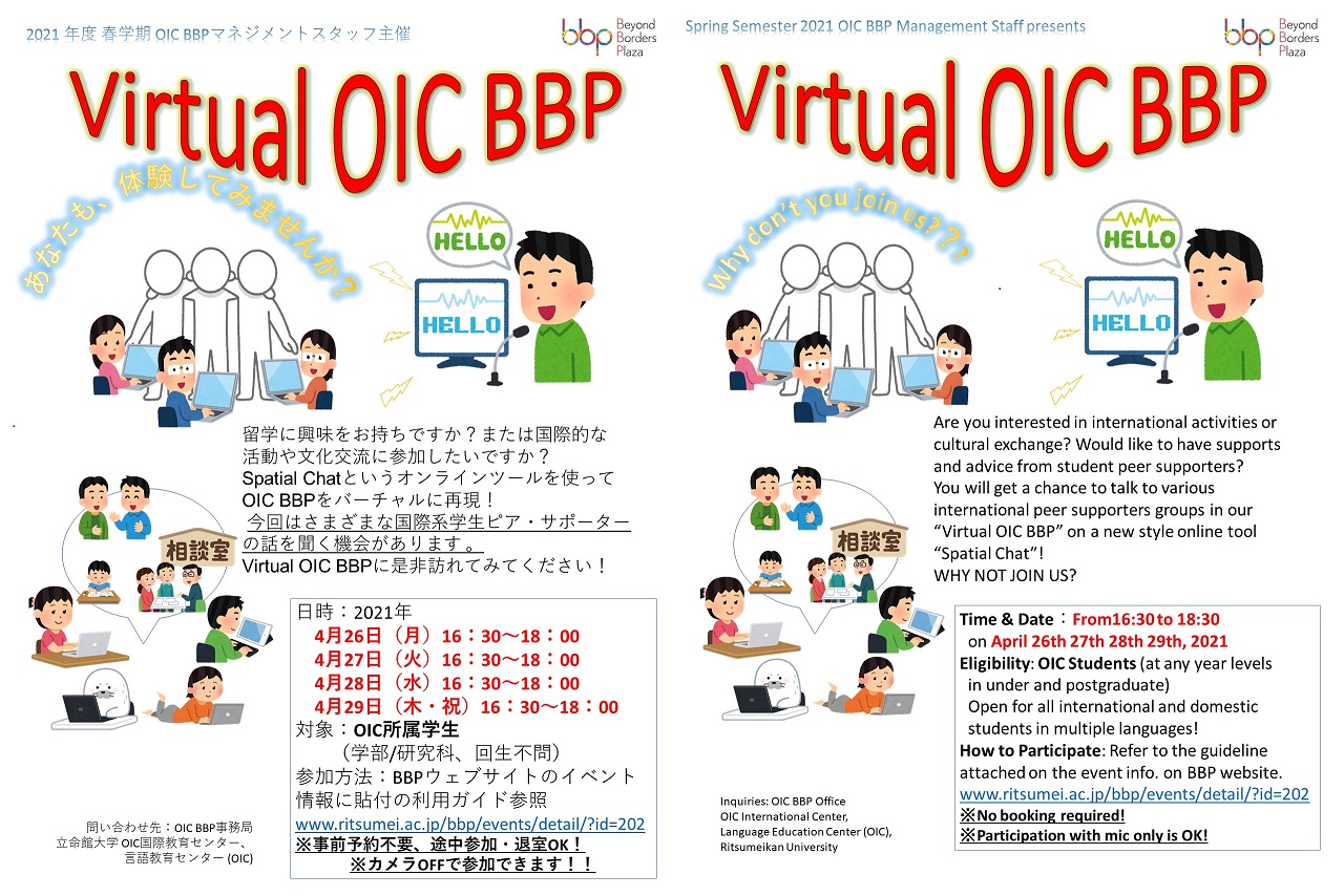 イベント情報Events home イベント情報 / Events OICのイベント アーカイブ Archive OICのイベント一覧 26 Apr Mon 衣笠 BKC OIC Virtual OIC BBP in April開催! 23 Apr Fri 衣笠 BKC OIC 留学入門セミナー@Zoom /Seminar for study abroad @Zoom 19 Apr Mon 衣笠 BKC OIC BBPってなに?on Zoom/ What is BBP ? on Zoom 29 Mar Mon 衣笠 BKC OIC 【動画UPしました】卒業おめでとう! BKC -BBPスタッフ&留学サポーター& BBP Friday cafe 26 Mar Fri 衣笠 BKC OIC 大学生活を充実させる方法 たっぷり学べるセミナー 24 Mar Wed 衣笠 BKC OIC ふらっとZoomでBBP/ Let's talk online! 27 Feb Sat 衣笠 BKC OIC (キャリア)世界は「やりたいシゴト」にあふれている ~グローバルに活躍している卒業生に、学生生活のヒントを聞くセミナー~ 【第1回】留学経験がゼロだった自分が辿った、意外なグローバルなキャリアの歩み方 10 Feb Wed 衣笠 BKC OIC 【BBP通信2月号発行!】BBPを楽しむ!知る!ための情報をたっぷりお届けします/【BBP Newspaper the February issue】We offer you the good information about BBP! 10 Feb Wed 衣笠 BKC OIC 【BBPフォトコンテスト】WEB写真展覧会/ BBP Photo Contest & Online photo exhibition Previous 1 2 3 4 5 6 7 8 9 10 11 12 13 14 15 16 17 18 19 20 21 22 23 24 25 26 27 28 29 30 31 32 33 34 35 36 37 38 39 40 41 42 43 44 45 46 47 48 49 Next