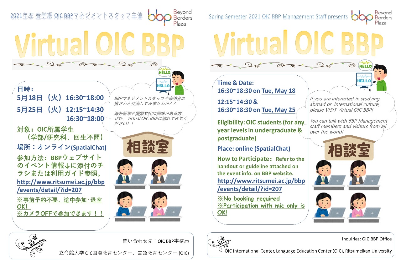 イベント情報Events home イベント情報 / Events OICのイベント アーカイブ Archive OICのイベント一覧 04 Feb Thu 衣笠 BKC OIC スペインをもっと知ろう! 21 Jan Thu 衣笠 BKC OIC 【動画UPしました】1/14 BBP主催 今こそ、海外挑戦。~海外経験ゼロから留学、コロナ禍のアメリカで就職。 自ら拓くキャリアとは~ 21 Jan Thu 衣笠 BKC OIC オンライン交流・相談企画 "Virtual OIC BBP" 14 Jan Thu 衣笠 BKC OIC BBP主催 今こそ、海外挑戦。~海外経験ゼロから留学、コロナ禍のアメリカで就職。 自ら拓くキャリアとは~ 13 Jan Wed 衣笠 BKC OIC BBP主催 Avatar in Zoom 10 Jan Sun 衣笠 BKC OIC 中国文化交流会/ Chinese Cultural Exchange event 08 Jan Fri 衣笠 BKC OIC 魁!!ことわざ祭り21!! / Be One Step Ahead!! Proverbs Festival 21!! 07 Jan Thu 衣笠 BKC OIC BBPカジュアルワークショップ、対話を通して違いを乗り越える! ~各国のコロナ対応、英語スラング~/ BBP Casual Workshop, overcome differences through dialogue – “World Responses to COVID-19”, “Let’s Study English Slang” 06 Jan Wed 衣笠 BKC OIC オンラインおしゃべり会「Be my friend Ⅱ」/Online chatting event "Be my friend Ⅱ" Previous 1 2 3 4 5 6 7 8 9 10 11 12 13 14 15 16 17 18 19 20 21 22 23 24 25 26 27 28 29 30 31 32 33 34 35 36 37 38 39 40 41 42 43 44 45 46 47 48 49 Next