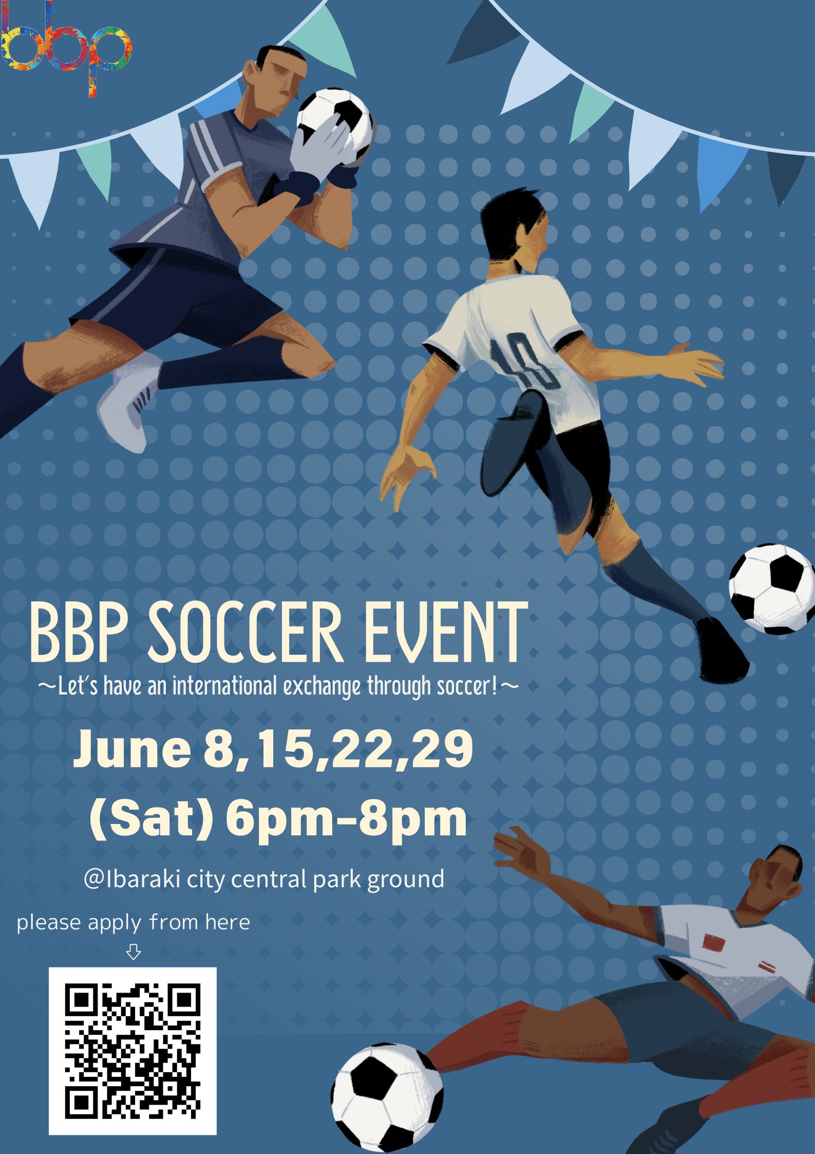 On Saturday, June 8, 2024, from 18:00 to 20:00, we will be holding a BBP soccer event “International exchange through soccer!”. Why don't we all play soccer and have an international exchange? If you are interested, please join us!