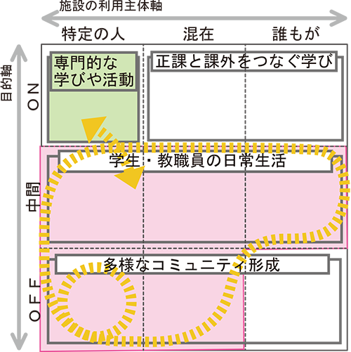 ON、OFFの活動に対して、学生を動かし、多くの人や情報に出会える環境づくりを行う。ON空間には、学部横断的な学びへと発展させるための交流空間や情報発信の場を整備し、OFF空間には新たな交流を促す空間を整備する。