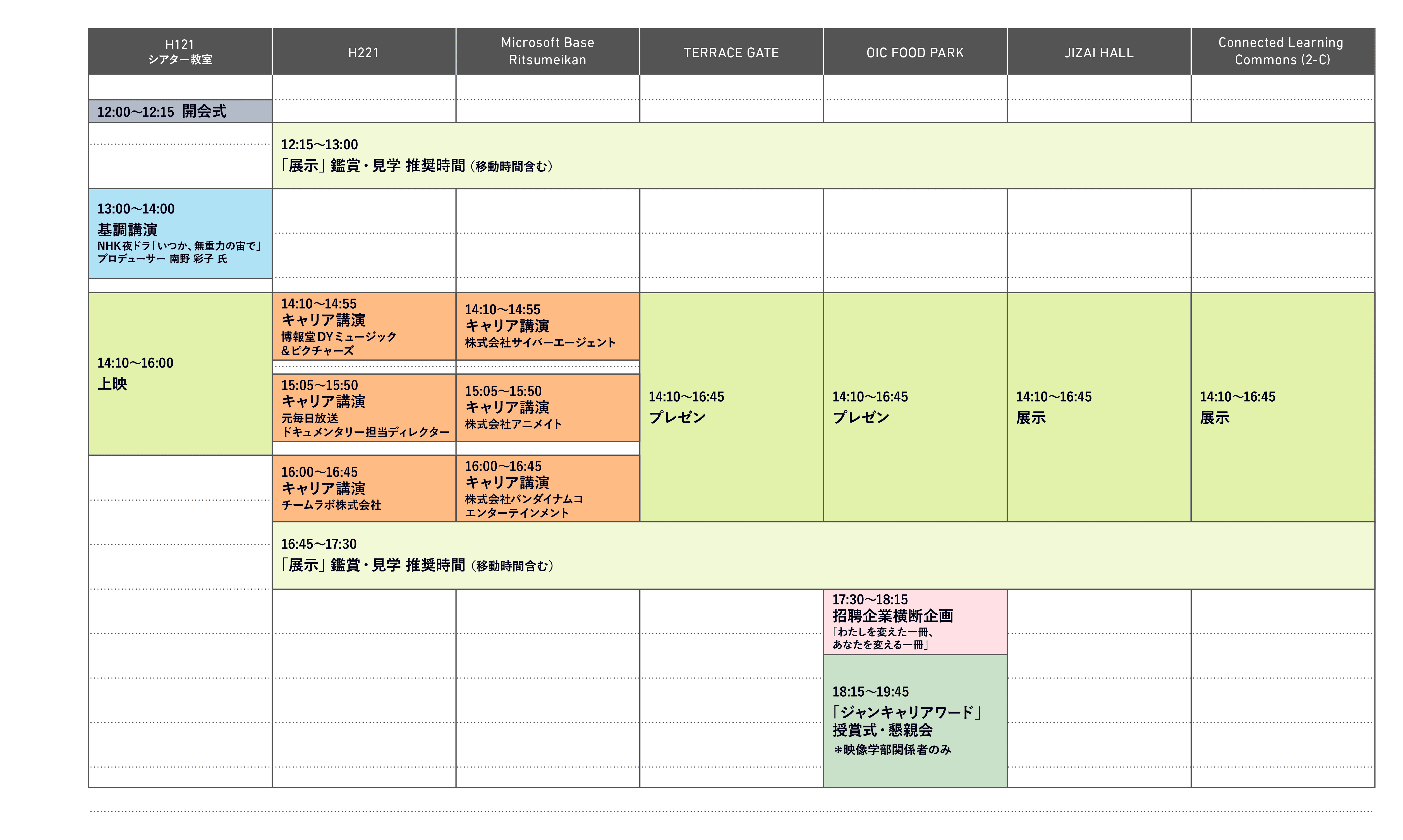 「ジャンキャリ」は、立命館大学映像学部生・研究科生の作品制作・研究の成果を学内外の方々に向けて発表する場です。さらにここでは、企業関係者や現場で活躍されているクリエイターの方々をお招きし、学部生・院生との交流を通して、作品制作・研究活動への意欲やキャリア意識の向上を促す、映像学部・研究科ならではの一大イベントです。企画の柱は、「基調講演」、企業関係者やクリエイターの方々による「キャリア企画」、学生による作品発表(上映、各種プレゼンテーション、ゲーム・VR・メディアアート作品展示など)です。