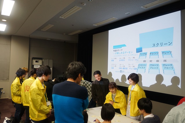 またその後グループに分かれ、北村 順生准教授(学生主事)から与えられたお題に対してグループごとにブレインストーミング(アイデアを出し合うこと)をおこない、その内容をまとめてプレゼンテーション(発表)するという体験をおこないました。映像学部はもちろんのこと、大学ではこういったグループワークやブレインストーミング、ディスカッションなどでお互いの意見を伝え合い、問題を発見・解決したり、新たなアイデアを創造したりといった授業も多く存在します。