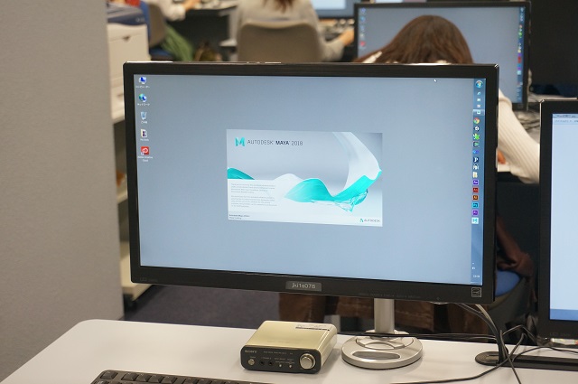 そして、いよいよCG制作ソフトの「Maya」を起動します。初回は思ったよりも起動に時間がかかります。映像学部の機材専門のスタッフや、授業のES(授業サポーター)が困った受講生のサポートをおこないます。手厚い!
