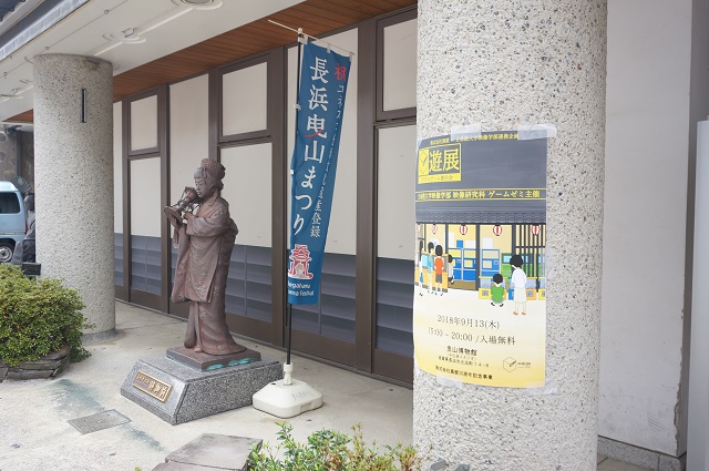 会場は長浜市の観光スポット「曳山博物館」です。ここは「長浜曳山祭」を紹介する博物館で、曳山の展示だけでなく、祭や各地のお祭りで活躍する振付(演出家)や義太夫、三味線奏者を養成する「三役修業塾」も開講し、無形文化財の伝承にも努めている場でもあります。今回はこの博物館の中にあるその名も「伝承スタジオ」という多目的ホールにてゲームゼミによる様々な展示を開催しました。