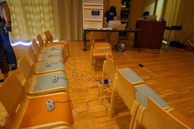 会場に入ると、ゲームを紹介するパネルと共に、10台以上のPCとコントローラー、ヘッドマウントディスプレイなどがあり、会場正面の大型プロジェクターには懐かしの「スーパーマリオ」のゲーム画面が映し出されています。その前にずらっと並べられた10台以上の椅子の上にはスーパーファミコンのコントローラーが1個ずつ置かれています。何が起こるのでしょうか。