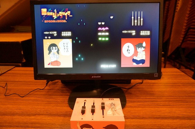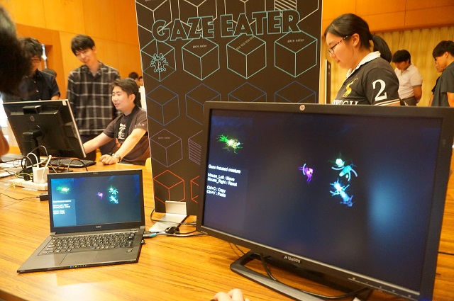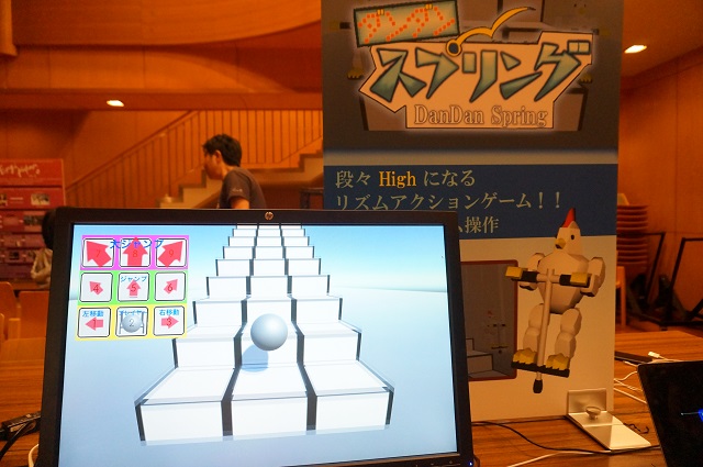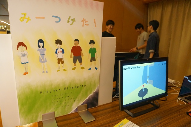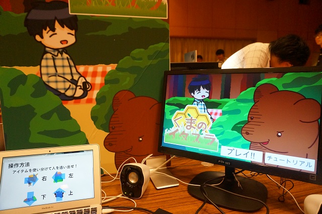 出展した学生たちはそれぞれ自分たちが制作した作品を参加者に丁寧に紹介しながら、プレイを促します。その操作性も非常にわかりやすいものが多く、初心者の人でもすぐに理解できるような工夫がなされていました。操作が簡単だからといって、ゲームが簡単というわけではなく、ついついもう一度チャレンジしたくなるような工夫がそこかしこにされています。キャラクターやステージのデザインも完成度が高く、ついつい見入ってしまう世界がモニターに広がっていました。