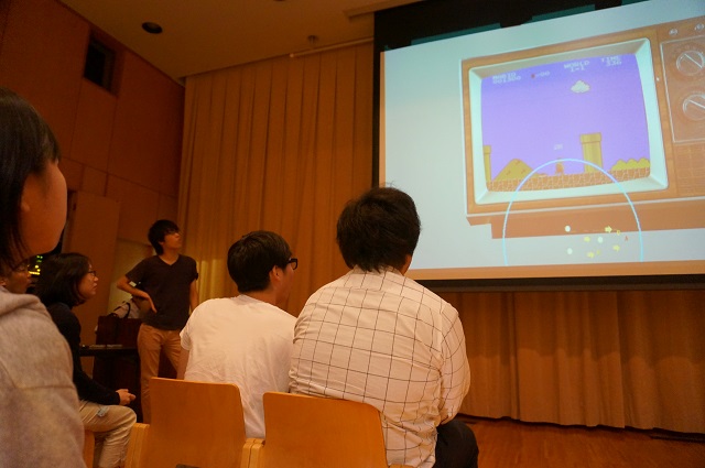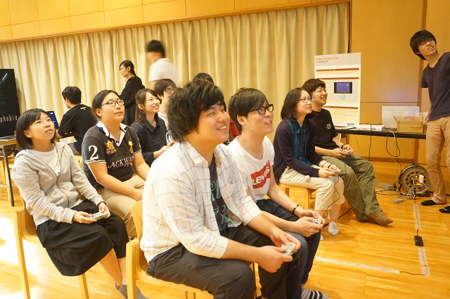 正面大型プロジェクターの前では研究科の院生によるプレゼンが始まり、その後椅子に座っているプレイヤー12名程度がコントローラーを握り、ゲームがスタートしました。これは、全員が気持ちを一つにして、例えば右に進みたい時は全員が右ボタンを一斉に押すと右に進み、左進やジャンプなど違う操作をするプレイヤーが多ければ多いほどその動きが制限されるという仕組み。