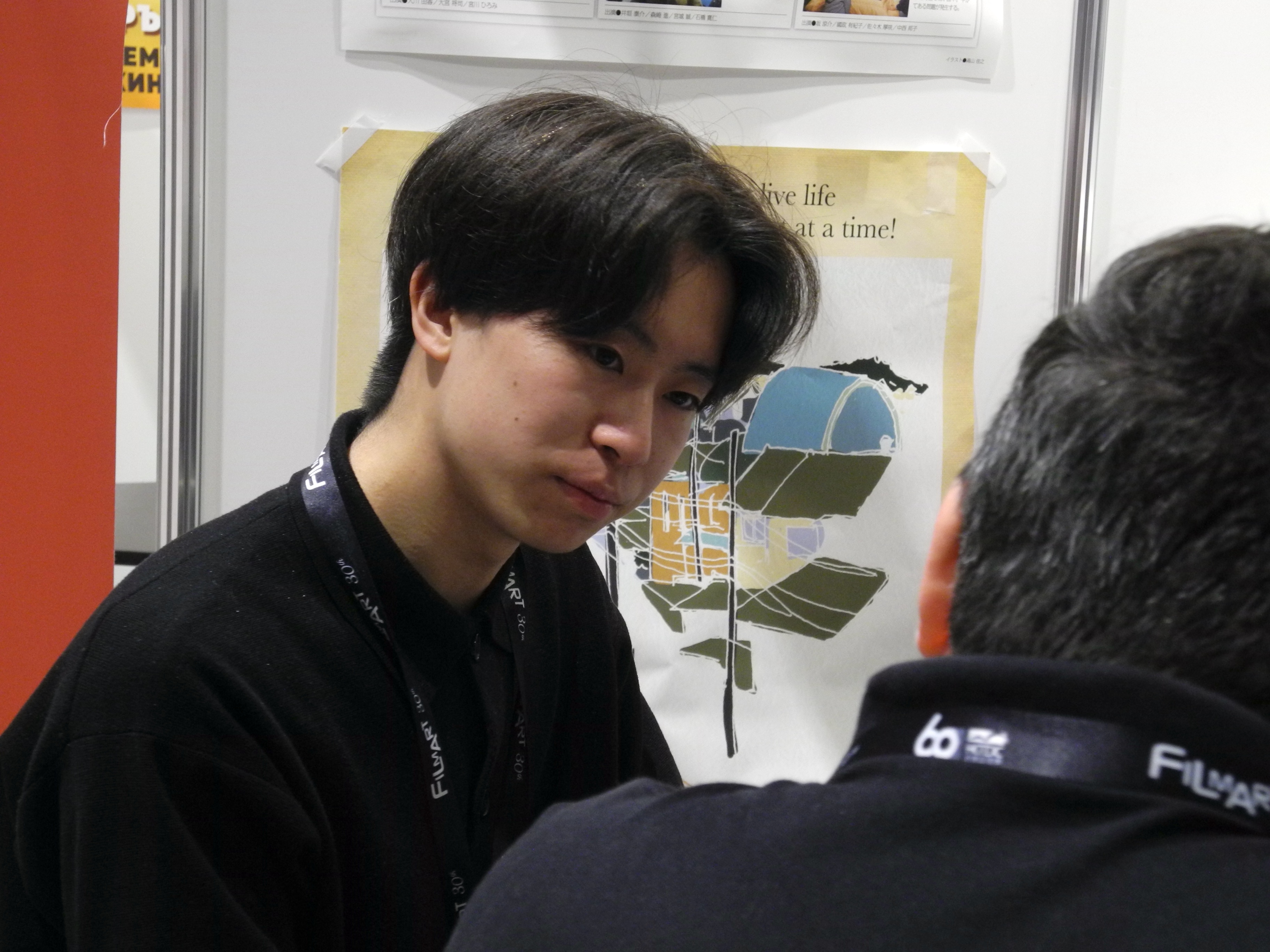 本イベントは映像制作におけるビジネス的側面を間近に見る絶好のチャンスであることから、学生たちも参加しています。三谷さん、大林さんは会場を訪れた映像業界関係者と英語でコミュニケーションをとり、商談を行いました。