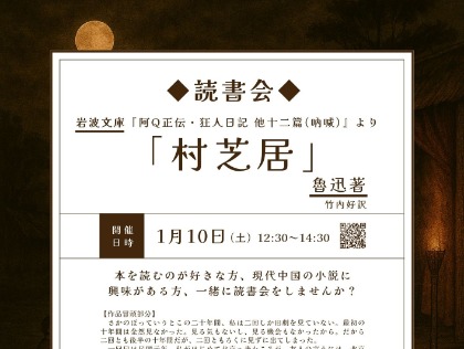 これからの講座・イベント 2 / 7 (土) 第215回中国理解講座 「干支吉祥剪紙を切ろう(午年)」 谷田 有似 氏(中国剪紙絵作家) 詳しく見る 1 / 10 (土) 2026年1月読書会「村芝居」魯迅を読む 永井 英美 氏(立命館孔子学院中国語講師) 詳しく見る 1 / 24 (土) 第214回中国理解講座 「中国の書と日本の書」(東京学堂) 承 春先 氏(大東文化大学、東洋大学、立命館孔子学院東京学堂講師) 詳しく見る 2 / 14 (土) 2026年春節イベント「中国語プレゼンテーション大会」 詳しく見る 12 / 7 (日) HSK 2025年12月7日(日)受験(申込締切:11月7日) 詳しく見る 10 / 7 (火)~ 2025年度後期 時事中国語翻訳講座~三潴正道先生のレベル式読解力養成講座 三潴正道氏 詳しく見る 一覧へ