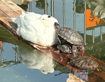 | ↑龍華寺には、写真のようなアヒルさんと亀さんがたくさんいました。 | ↑玉佛禅寺のきのこ麺(約240円)と蓮花酥(約160円)。どちらも美味しかったです。 |