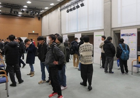 また、1月15日と1月20日にはポスターセッションが開催され、同級生や下回生の多くが参加しました。当日は、教員も交えての活発な意見交換がなされ、自身の研究分野だけでなく、異なる研究分野についても知ることができる有意義な時間になったのではないでしょうか。
