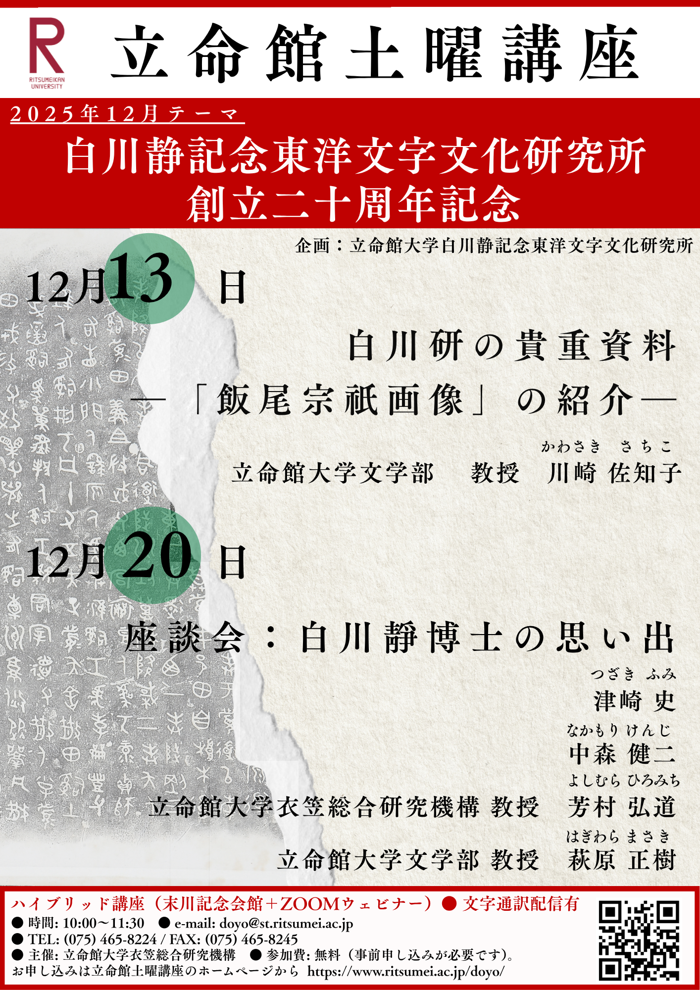 13 Dec SAT 2025.12.13(土)10:00~11:30 【立命館土曜講座】ハイブリッド講座「白川研の貴重資料 ―「飯尾宗祇画像」の紹介―」 開催日時 2025年12月13日(土)10:00~11:30 場所 対面(衣笠キャンパス末川記念会館)+オンライン(ZOOMウェビナー)同時開催 申し込み方法 参加費:無料(事前申込制) 立命館土曜講座 2025年12月13日(土)10:00~11:30 https://www.ritsumei.ac.jp/doyo