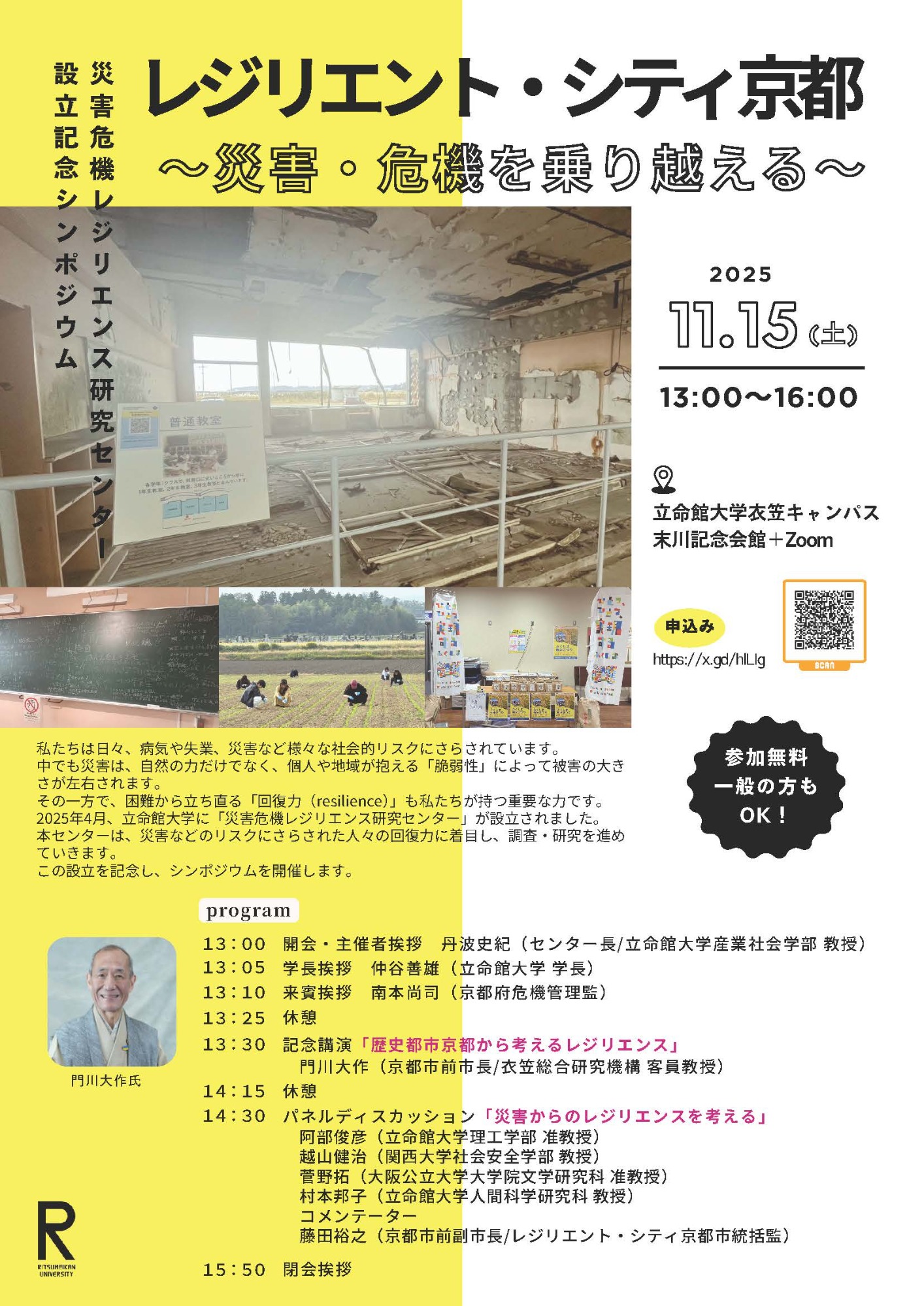 15 Nov SAT 2025.11.15(土)13:00~16:00 災害危機レジリエンス研究センター 設立記念シンポジウム「レジリエント・シティ京都~災害・危機を乗り越える~」 開催日時 2025年11月15日(土)13:00~16:00 場所 対面(衣笠キャンパス末川記念会館)+オンライン(ZOOMウェビナー)同時開催 申し込み方法 参加無料、一般の方も参加OK! 申込みはこちら https://x.gd/BDVad