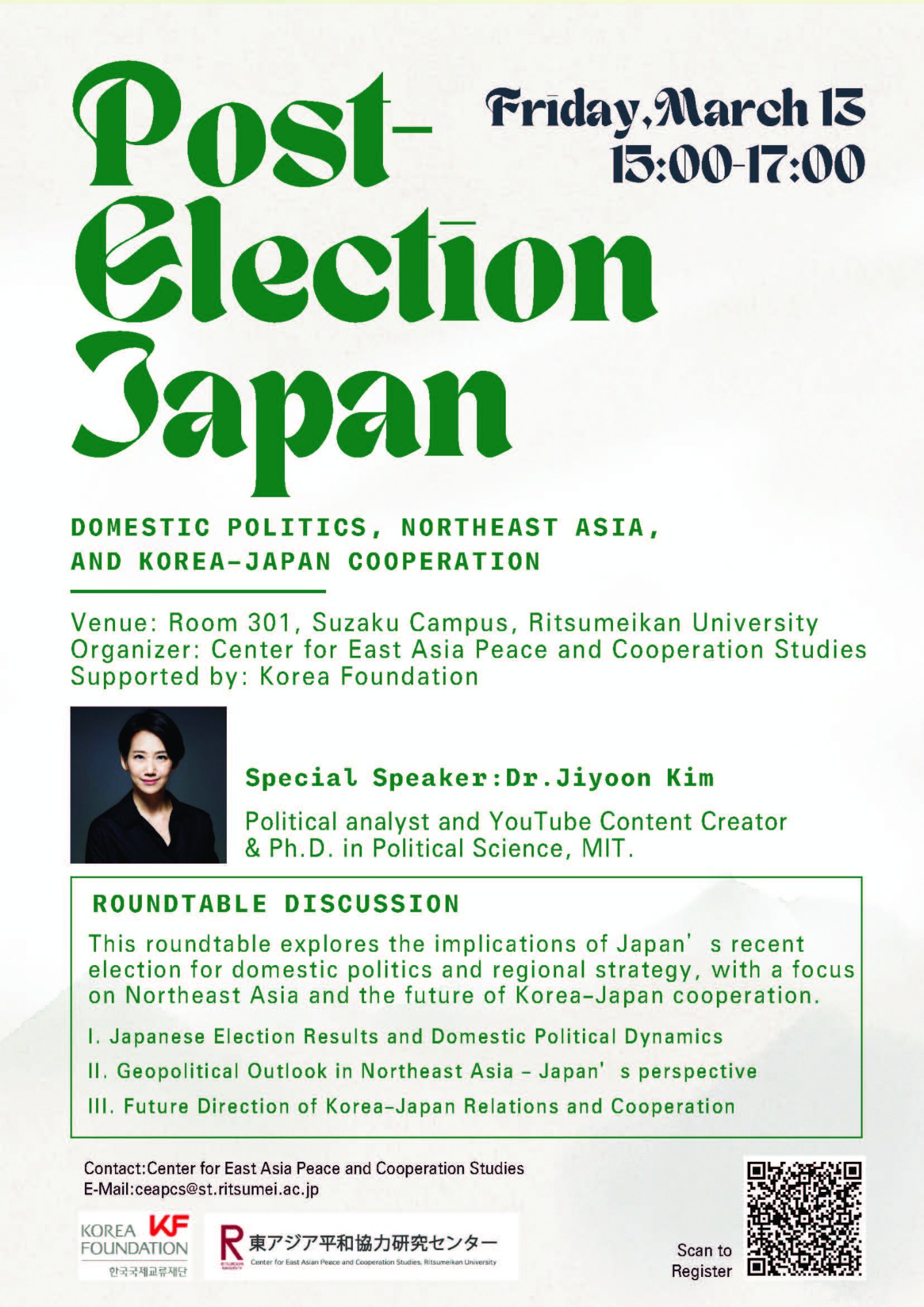 13 Mar FRI 2026.3.13(金)15:00~17:00 Post- Election Japan 国内政治、北東アジア情勢、そして⽇韓協⼒の展望 開催日時 2026年3月13日(金)15:00~17:00 場所 朱雀キャンパス 301教室 申し込み方法 申込み:https://x.gd/AlwxK 問い合わせ先 東アジア平和協力研究センター:ceapcs@st.ritsumei.ac.jp