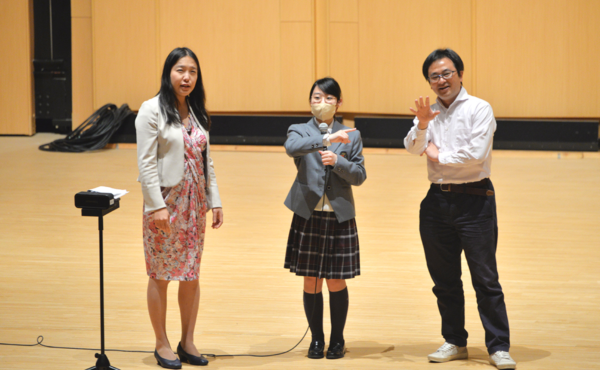 ゲーム終了後には中島さんと生徒のセッションが行われました。「みなさん無事に魔王から逃れての帰還、おつかれさまでした。私も謎を解きながらたくさん歩きました」と生徒を労った中島さんは、「謎解きの内容に加えて、演劇感がたっぷりの仕草など、クスッと笑える要素があっておもしろかったです」とコメント。そして、生徒に今日の体験を通じた気づきを問いかけたところ、数名の生徒がステージに上がり意見を述べました。