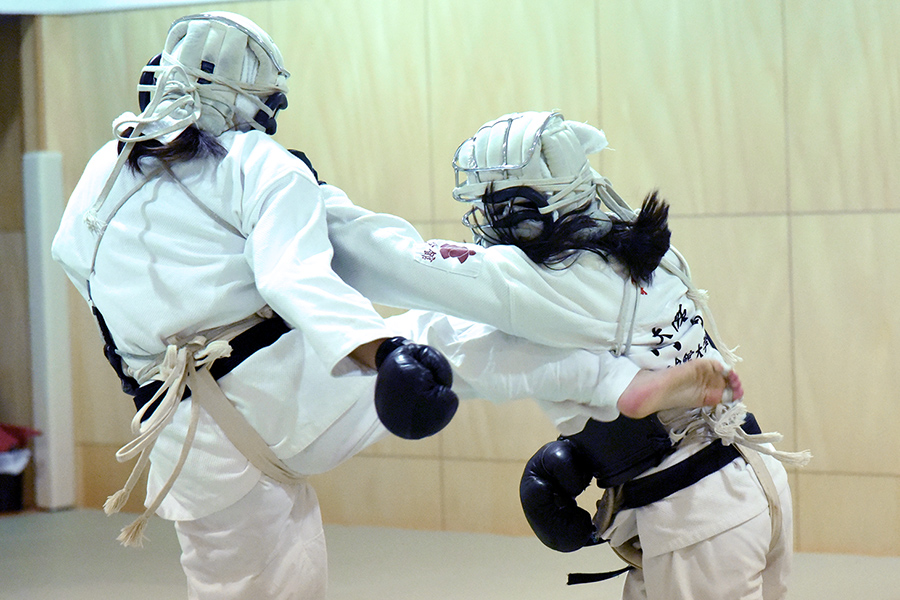 空手や柔道、古武術などをとりいれた実践的な総合格闘技である日本拳法。2018年6月現在、39人が所属し、学生同士で教えあい、稽古に励んでいる。普段は衣笠キャンパスとBKCに分かれて稽古を行い、週に1度は合同で行う。2017年12月の全国学生拳法選手権大会(団体戦)では、男子はベスト8、女子は準優勝の成績を収めるなど、実力のあるチーム。目標は、1年の集大成でもある、全国学生拳法選手権大会での優勝だ。