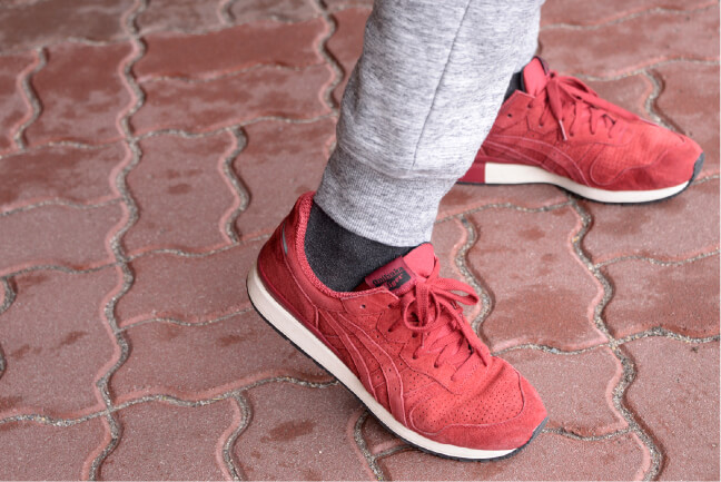 - 柄物のパンツ、シルバーの靴、イヤリング