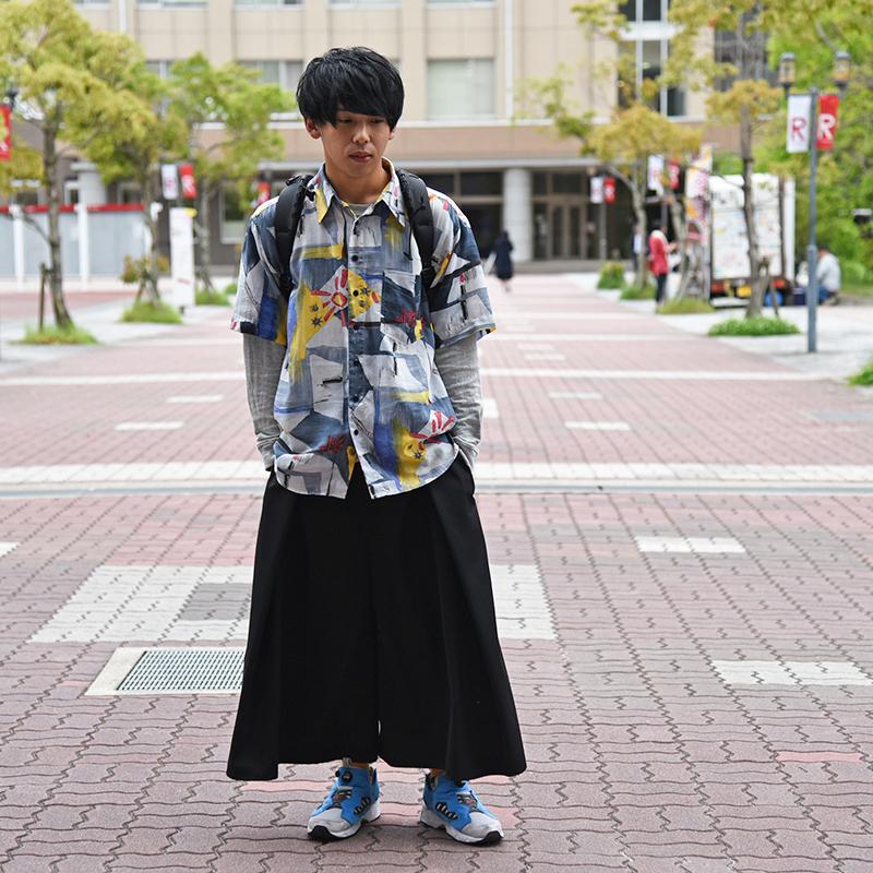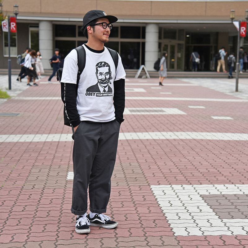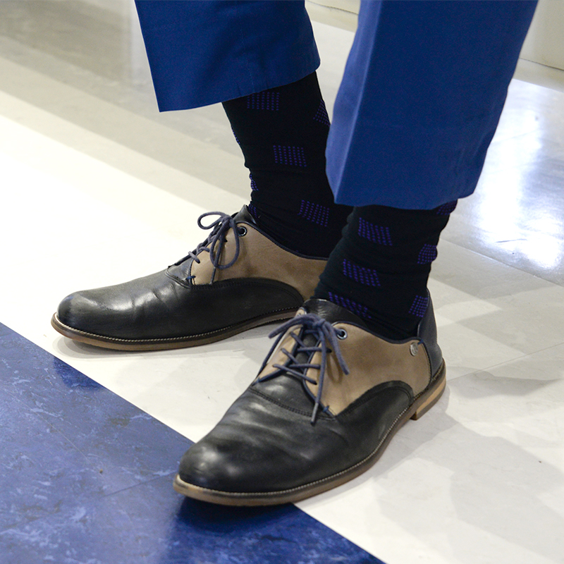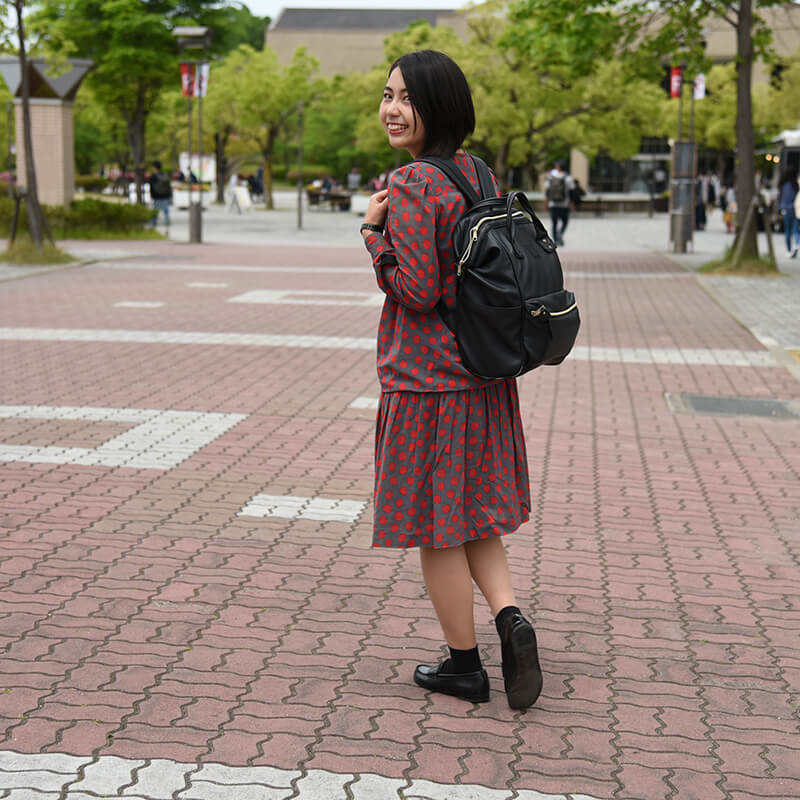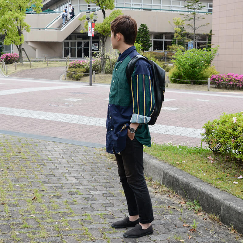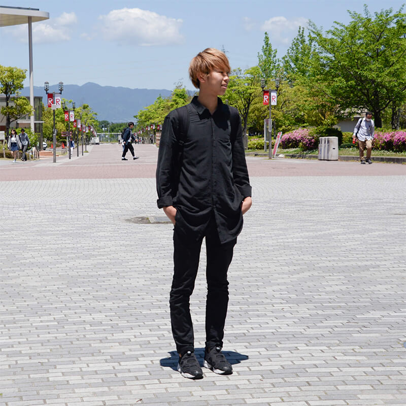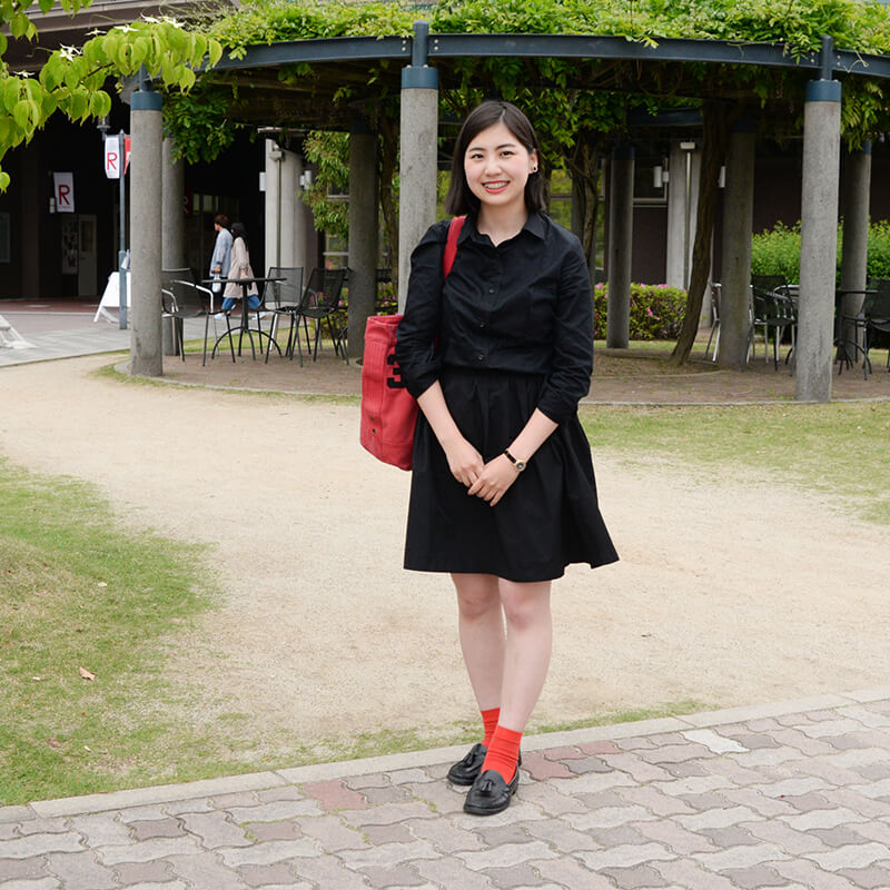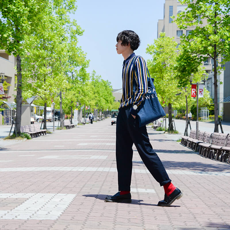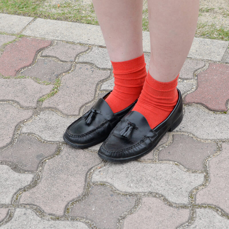 - 全体は黒のコーディネートでワンポイントの赤い靴下