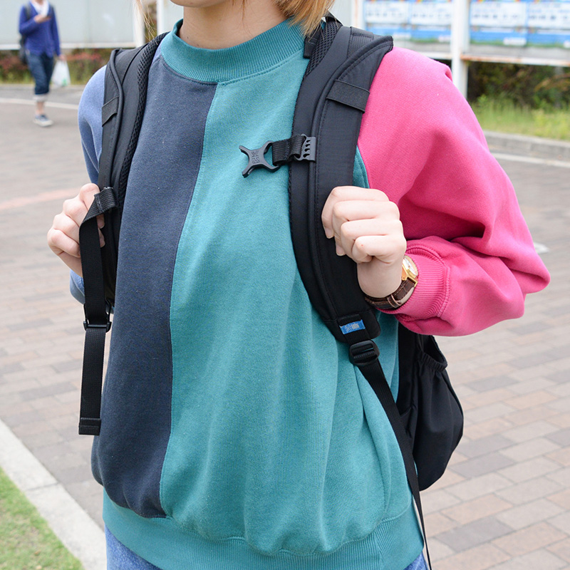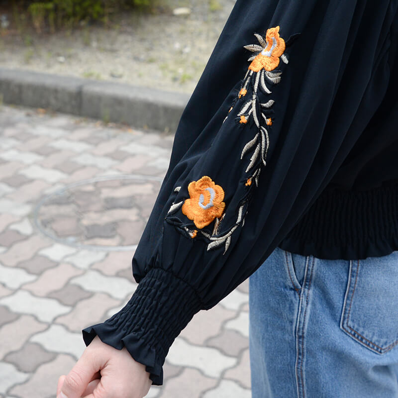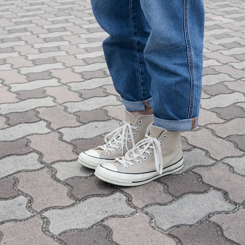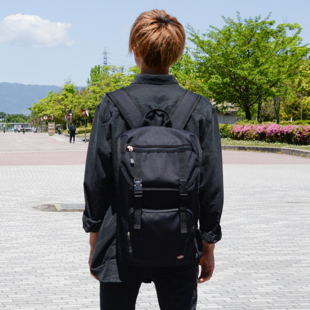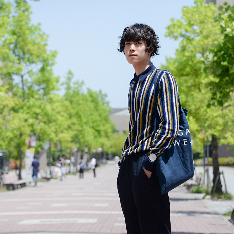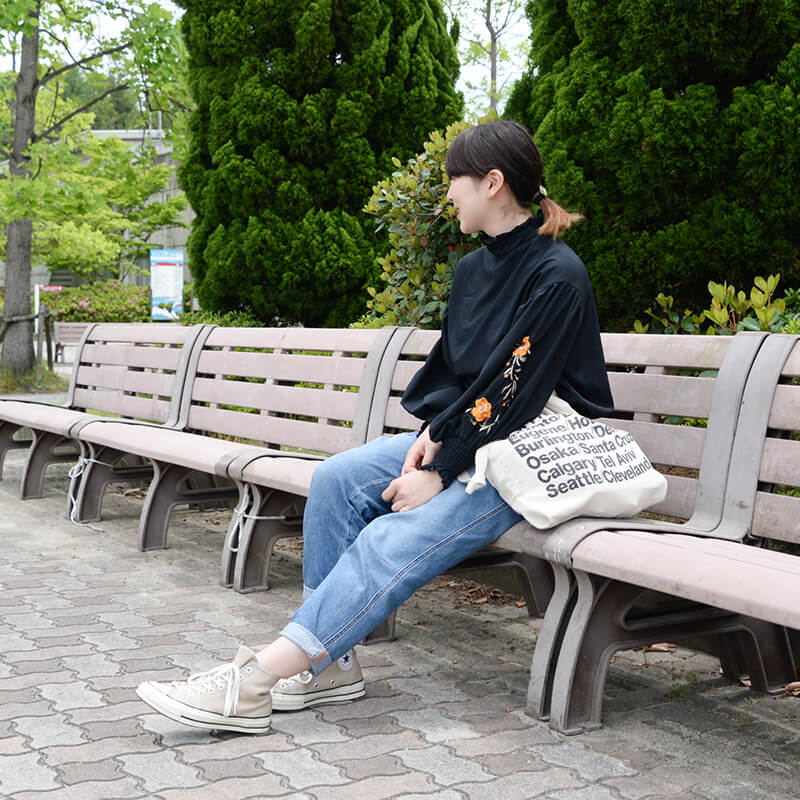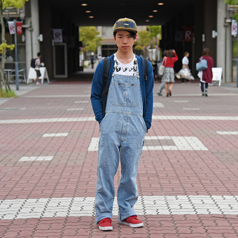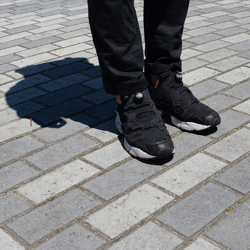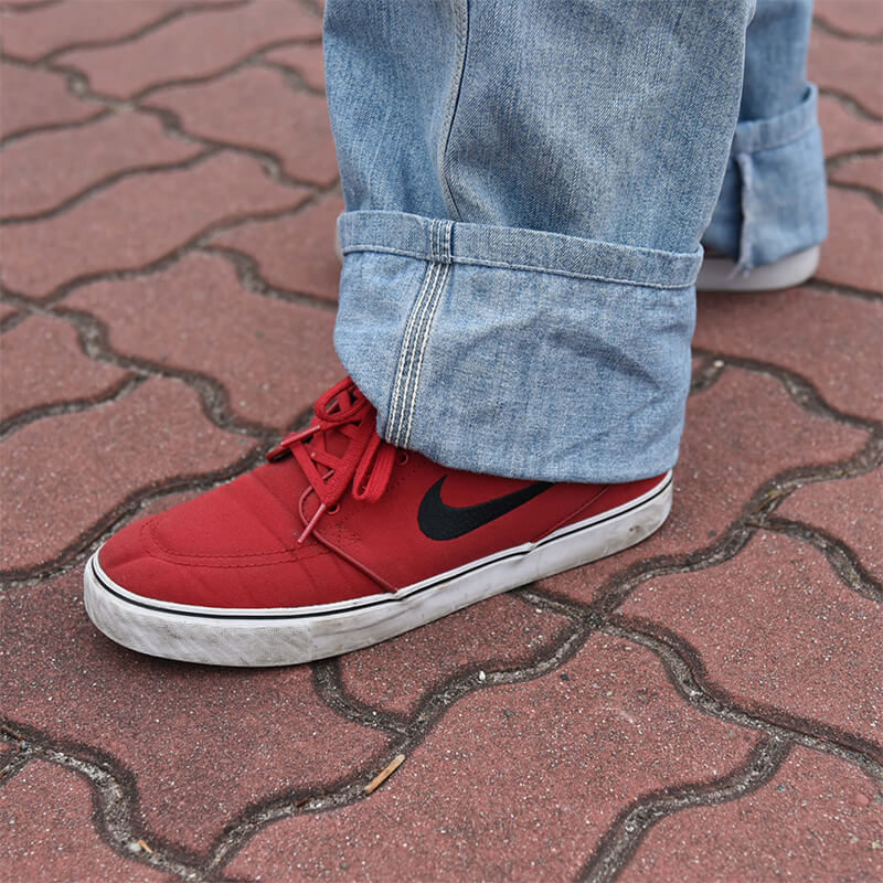- 全体は黒のコーディネートでワンポイントの赤い靴下