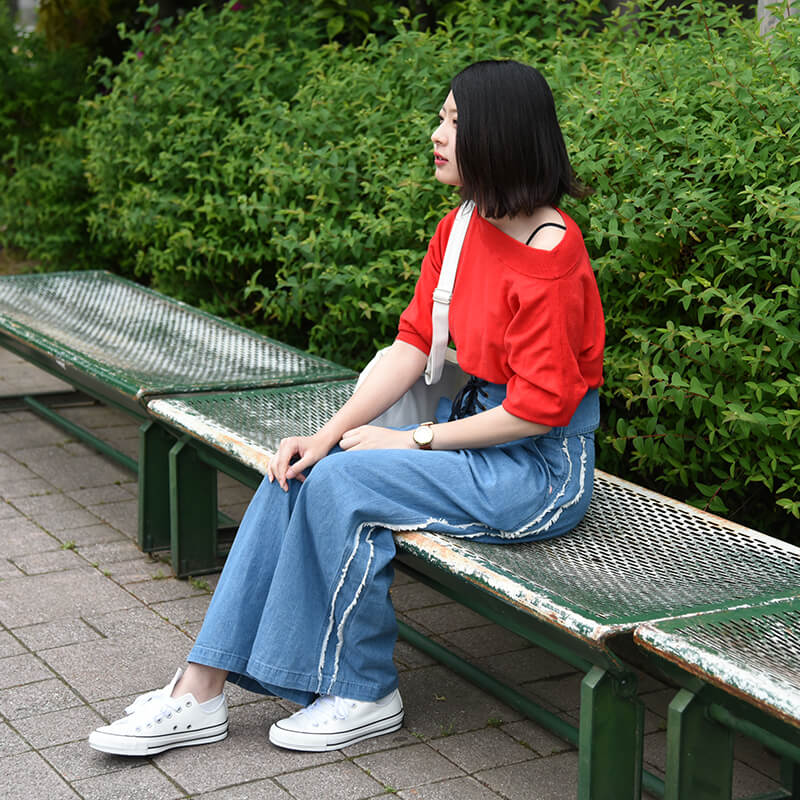 - オフショルダーの赤トップス