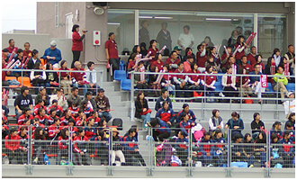 立命館ホリーズスタジアムは、ホッケー専用人工芝が敷かれ、ホッケー競技の国際規格に対応したホッケー場です。ホッケーだけでなく、ラクロスなどの他の競技にも使用できるんですよ!アップグラウンドを含む面積は129.6m×70.0m、フィールドは91.4m×55mの広さ。スタンドの2階には計826席が設置されています。キャンパス内にあるスタンドを立命館の色に染めてホッケー部にYELLを送りましょう!