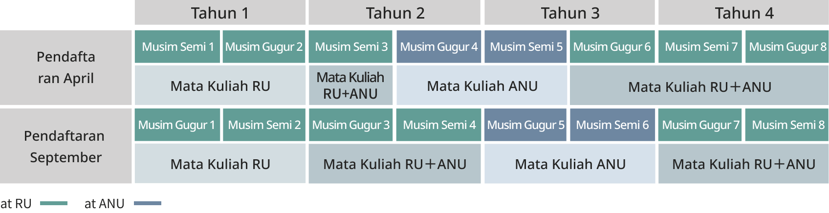 Umumnya, mahasiswa harus memperoleh minimal 124 SKS (disebut credit di RU) untuk mendapatkan gelar RU dan 192 SKS (disebut unit di ANU) untuk mendapatkan gelar ANU. Namun, berdasarkan perjanjian antara kedua universitas dalam program gelar ganda, 64 SKS yang ditransfer dari mata kuliah RU diakui sebagai 96 SKS di ANU, dan 96 SKS yang ditransfer dari mata kuliah ANU diakui sebagai 60 SKS di RU. Pengaturan ini memungkinkan mahasiswa untuk memperoleh kedua gelar tersebut dalam empat tahun dengan menyelesaikan 64 SKS mata kuliah RU dan 96 SKS mata kuliah ANU.