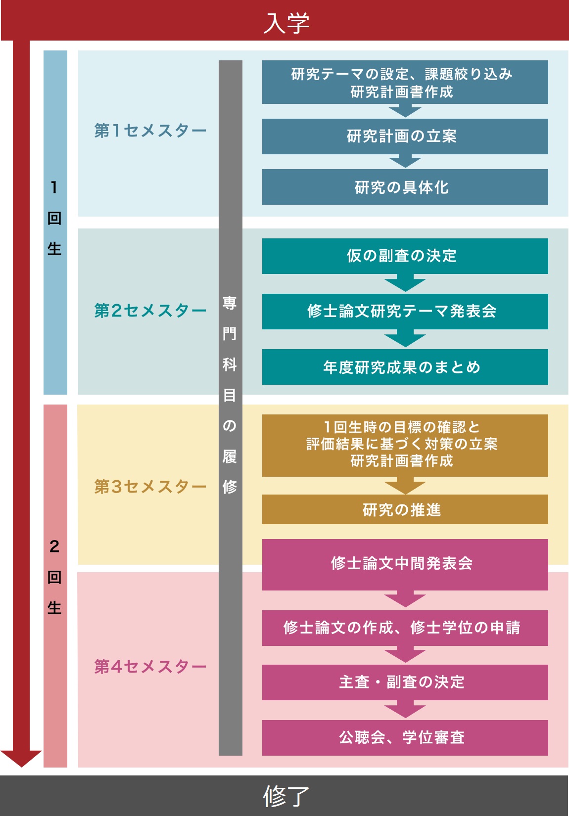 標準修業年限(2 年)以上在学し、「共通科目」、「固有専門科目」、「特殊研究科目」に区分したそれぞれの必要単位数を含め、合計30 単位以上修得するとともに、必要な研究指導を受けたうえで修士論文を提出し、