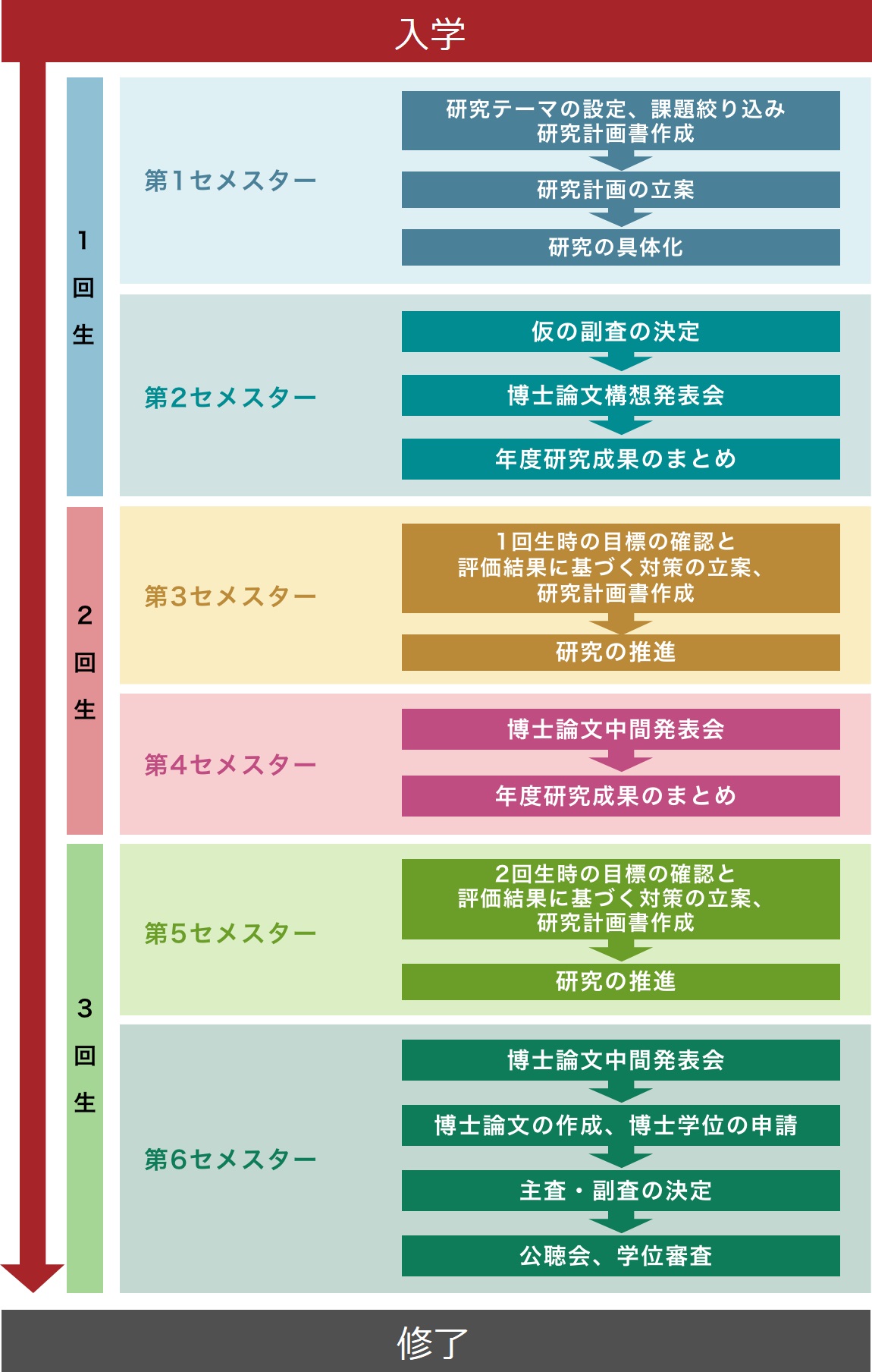 標準修業年限(3 年)以上在学し、「情報理工学特別研究」を8 単位以上修得するとともに、必要な研究指導を受けたうえで博士論文を提出し、審査および試験に合格しなければならない。