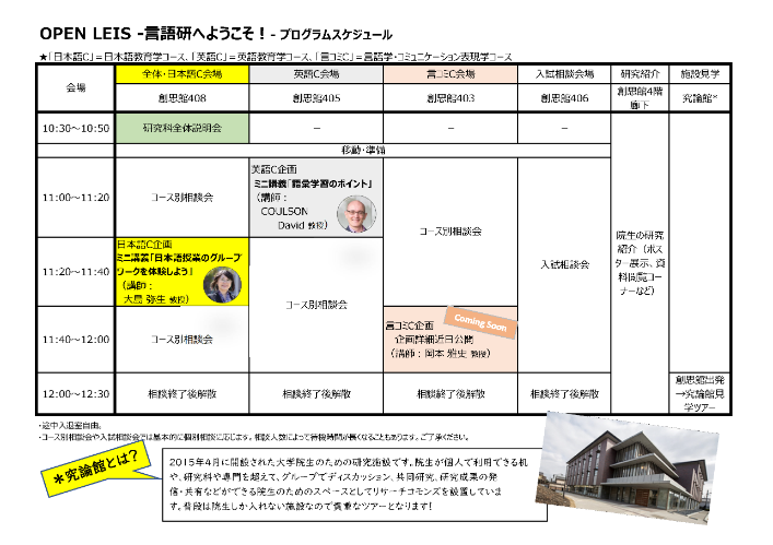 言語教育情報研究科では11月10日から15日にわたり対面企画として授業見学(一部オンライン参加も可能)と「OPEN LEIS ー言語研へようこそ!ー」を開催いたします。