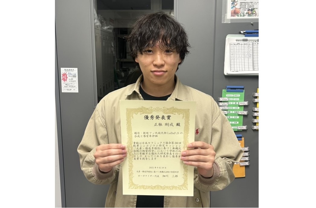2025.10.16生命科学研究科2回生 正躰剛成さんが公益社団法人日本セラミックス協会 第38回秋季シンポジウムにおいて優秀発表賞を受賞しました!!