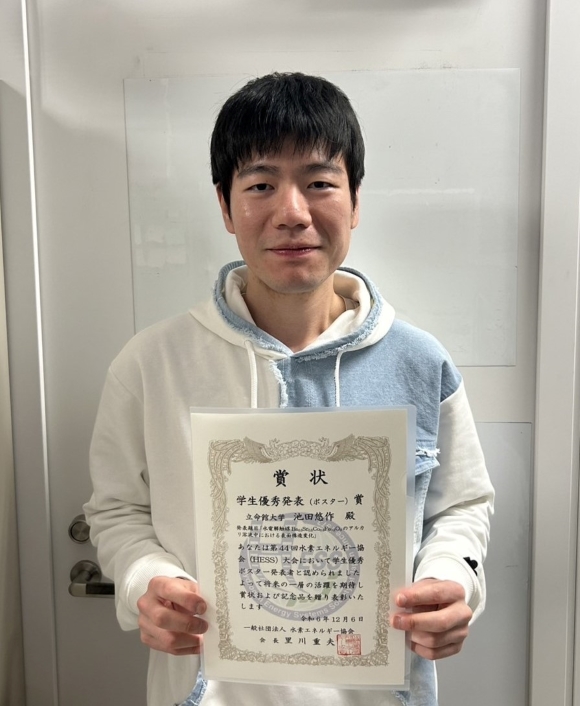 生命科学研究科2回生 池田悠作さんが第44回水素エネルギー協会大会にて学生優秀発表賞を受賞しました!!