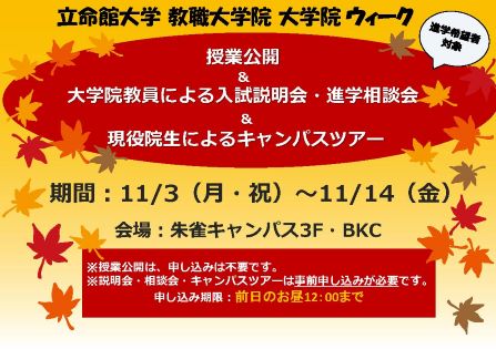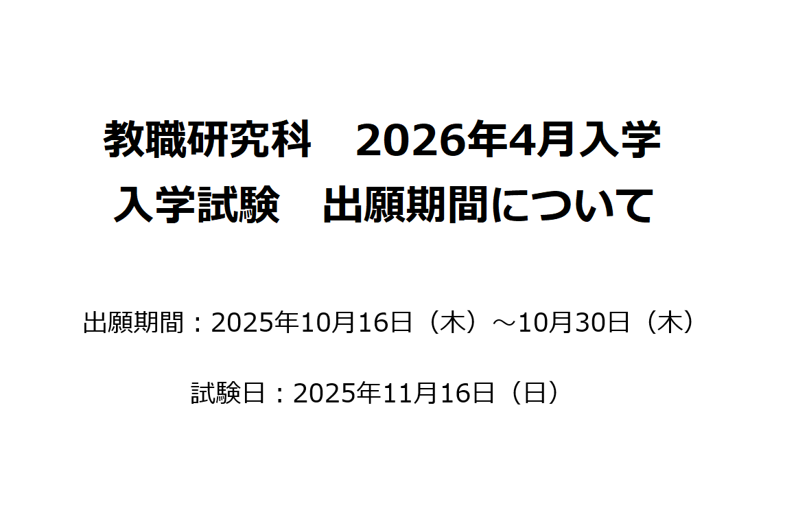 PICK UP 10月実施入試説明会受付中 11月実施入試出願期間(10/16-10/30) オンライン受講で 修了が可能に! 2023年度からの 新カリキュラム 教職大学院認証評価で 「適合」の認定 動画で知る 立命館大学教職大学院 NEWS & TOPICS 一覧へ NEWS 2025/10/09 教職研究科が分かる!2025大学院ウィーク開催【11/3~11/14】 NEWS 2025/10/07 【2026年4月入学】2025年11月入学試験の出願期間のお知らせ NEWS 2025/09/24 2026年4月より、北海道教育大学との単位互換制度が始動! TOPIC 2025/09/17 立命館大学ウェブマガジン『shiRUto』に神藤貴昭教授の記事が掲載されました!【9月1日が怖い】 NEWS 2025/09/02 立命館学校教育研究会 2025年度秋季大会開催のご案内 COLUMN 2025/09/02 【教員コラム】いのちをまもる ー学校の安全対策ー(2025年9月2日配信) NEWS 2025/08/28 10/26(日) 立命館大学実践教育学会 第9回研究大会参加申し込み受付中(~10/13まで) NEWS 2025/04/03 2025年度実施入試説明会-日程・申込- ADMISSION 入試日程 年間4回の入試を実施 more 入試説明会 年間を通じて、オンライン・対面で説明会を実施 more 学費・奨学金 学費詳細と豊かな大学院生活をサポートする奨学金制度 more よくある質問・問い合わせフォーム 教職大学院の各種制度や入試に関する問い合わせ more ABOUT 5つの特長 私立総合大学としての特色を活かした新しい教学展開 more カリキュラム 3つのコースを中心とした多様な科目展開と実践的な学び more 目指す教員像・資格 more 教員コラム more