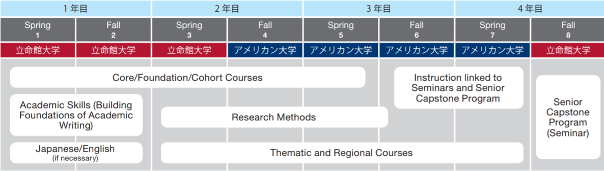これまで紹介してきたように、RUホーム学生は、立命館大学で最初の1年半は基礎的な内容を学びます。その学びを引き継いでアメリカン大学で2年間、より発展的なアカデミック・スキルを身につける学びを継続しつつ、専門科目や地域研究を中心に専門的な学びを深めていき、卒業論文に向けた研究を深めていきます。